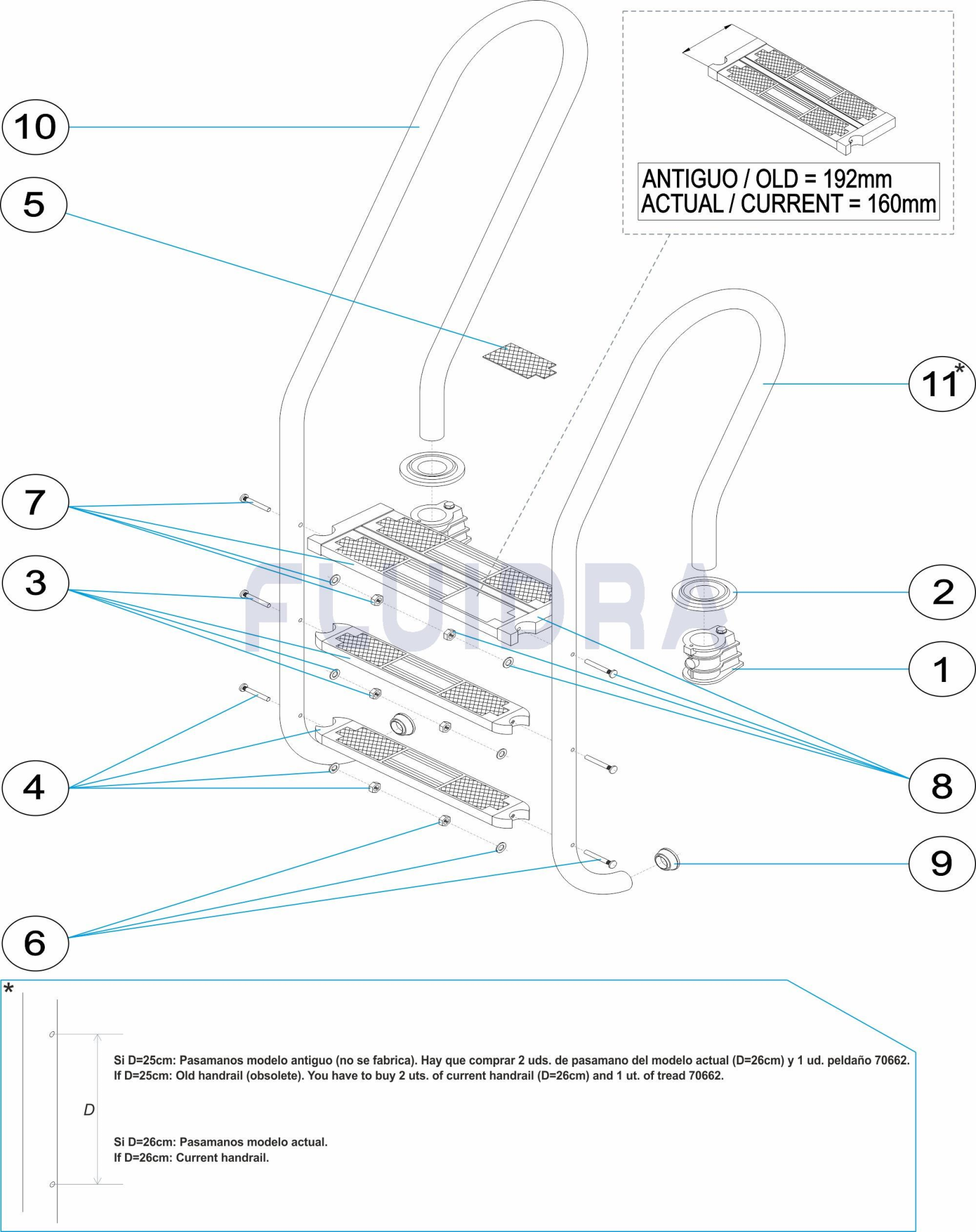 Стълби с парапет модел Mixte, за вградени басейни. Тръба Ø 43 mm от полирана неръждаема стомана. Стъпала от неръждаема стомана с противоплъзгаща повърхност. Доставя се с фиксиращи анкери, предвидени за изравняване на потенциалите. Парапети и стъпала от AISI-316L