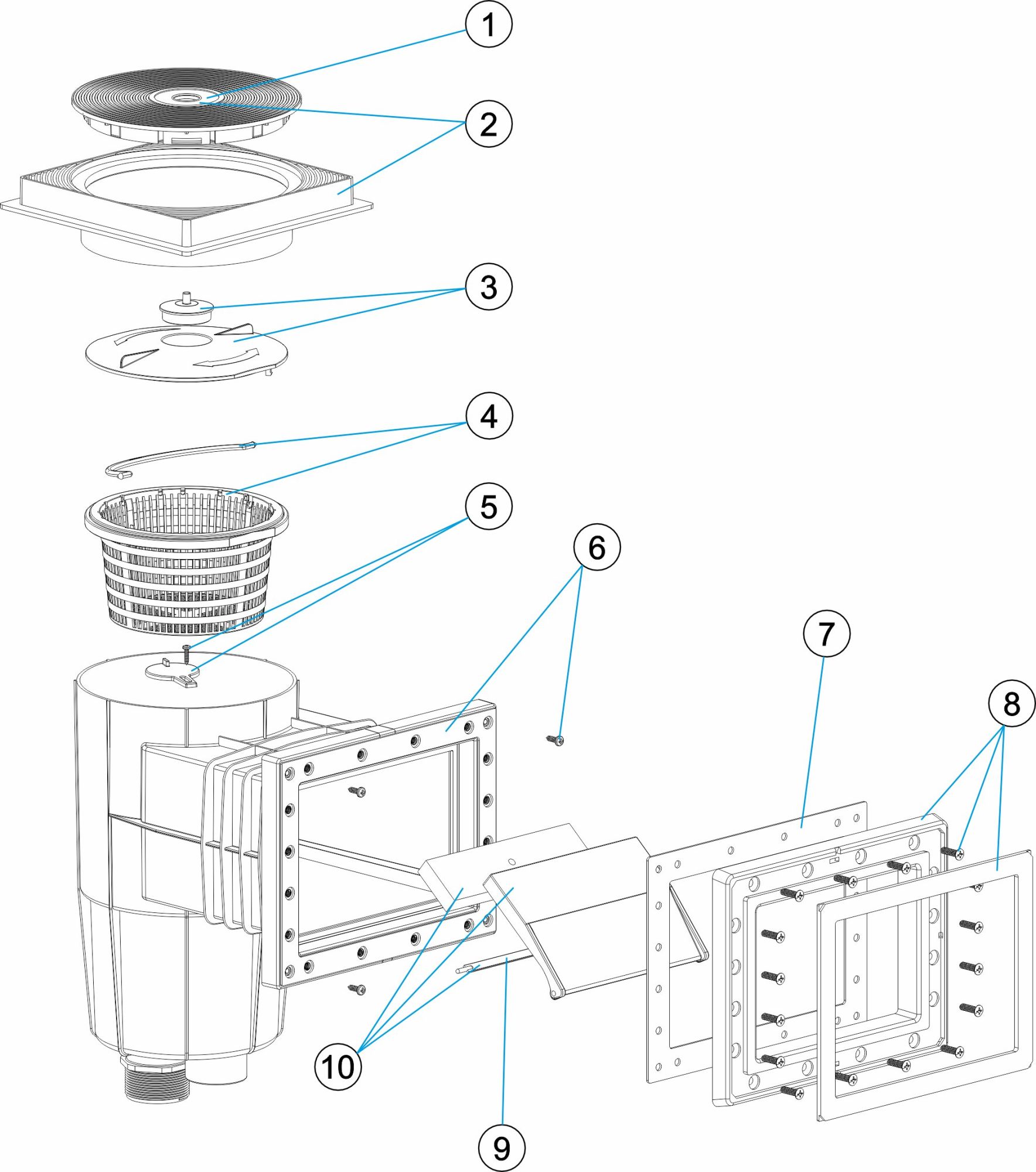 Подложка и преф. басейн - 15 L Скимери • Всички компоненти, които са изложени в тази гама скимери, са с UV обработка. • Изработени от ABS, те се доставят с преградна клапа и възвратен клапан на регулатора на потока. • Връзка на долната смукателна дюза: 11/2" вътрешна резба, 2" външна резба. • Едновременно свързване към главния отвод: Ø 50 mm вътрешна стена. • Преливна връзка: Ø 40 мм. • Капан за листа. • Препоръчителен дебит: 7,5 m3/h. • Препоръчително е да се инсталира един скимер на всеки 25 m2 водна повърхност. • Всички скимери се предлагат в два различни модела: модел с вложки и модел PARKER, който се доставя със самонарезни винтове. Доставя се със залепващо уплътнение, двушприцована рамка, фланец и винтове.