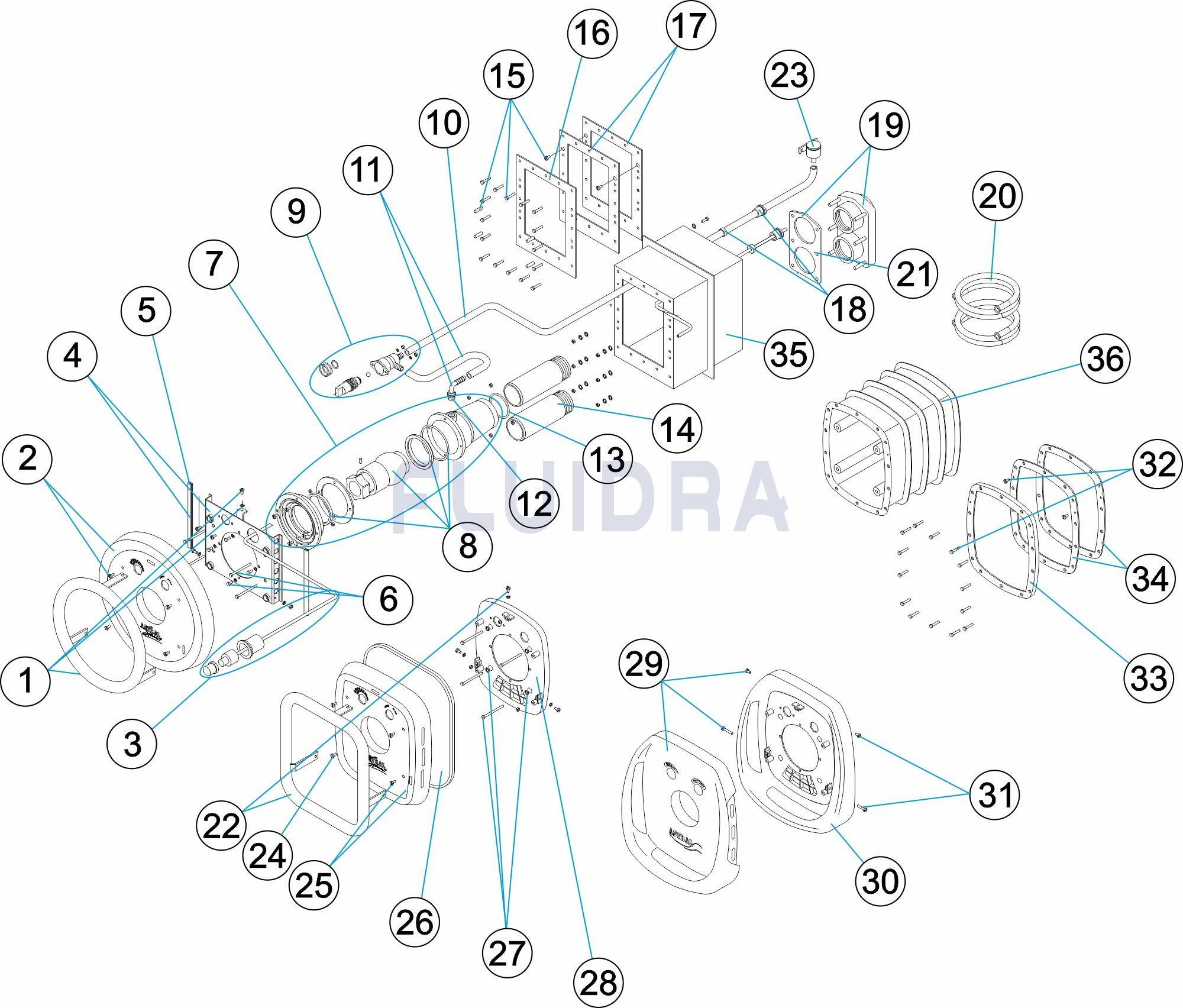 Комплекти дюзи с правоъгълен преден капак от бяла пластмаса и вградена дръжка. Състои се от: преден капак, комплект дюзи, стоп/старт контрол и контрол за регулиране на въздуха.