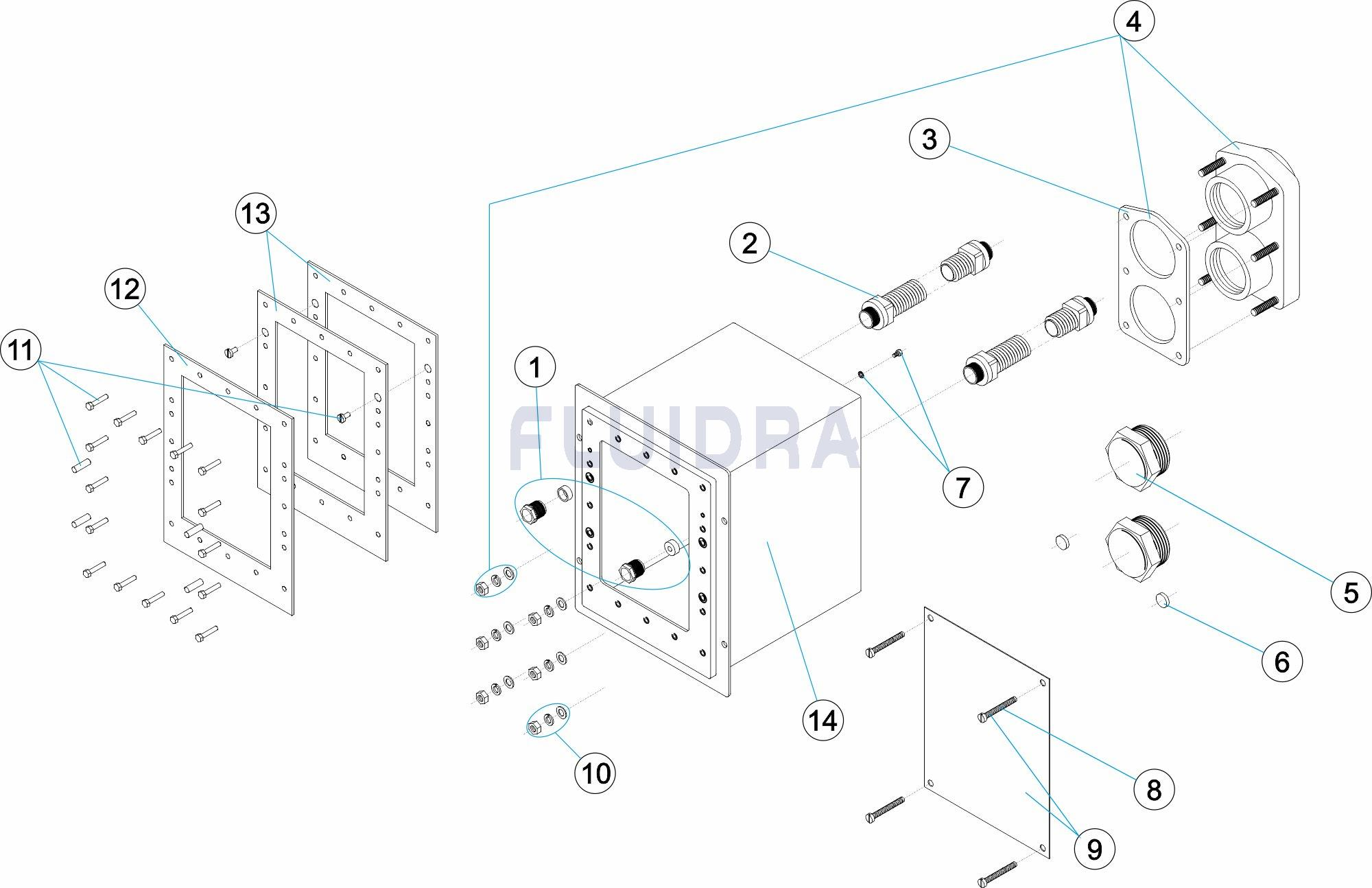 Корпусна кутия от неръждаема стомана. От неръждаема стомана AISI-316 с дълбочина 240 mm. Готови за монтаж както в бетонни, така и в сглобяеми басейни. Доставя се с уплътнителни елементи и два кабелни маркуча по 3 м.