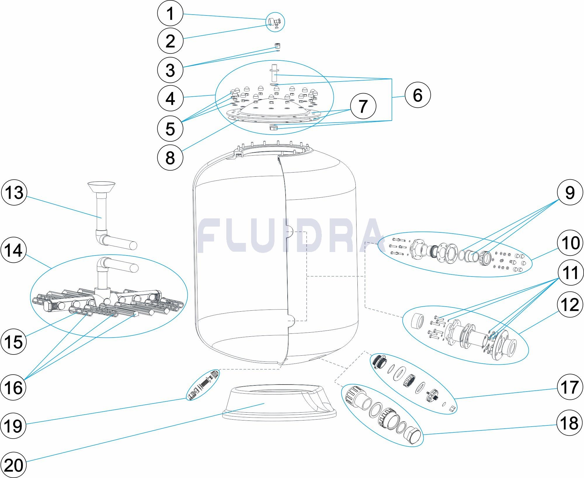 • Филтри от фибростъкло и полиестерна смола с вътрешни компоненти и аксесоари от висококачествена инженерна пластмаса. • Благодарение на двойното си покритие, полученият корпус е изключително устойчив, издръжлив и надежден. • Съвместим с пясък и стъкло, между другото. • Отговарят на изискванията за филтриране съгласно стандарт EN 16713-1. Ø 230 mm завинтващ се капак, шприцован. Снабден с ръчни вентили за изпускане на въздух и вода, манометър и странично монтиран многопортов вентил. Максимална скорост на филтриране (m3/h/m2) Съответства на изискванията за филтриране съгласно стандарт EN 16713-1. Съвместим с пясък и стъкло