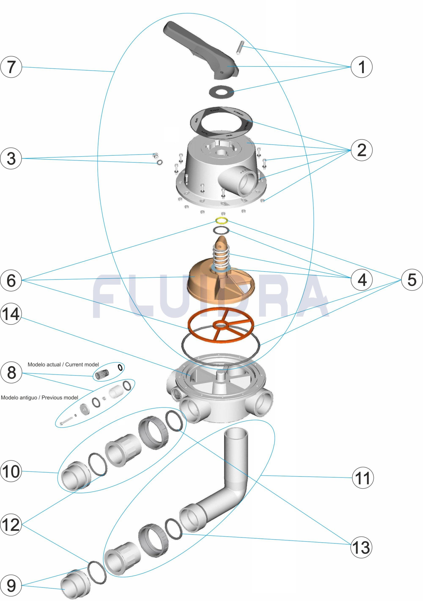 6-пътни селекторни вентили. Шест начина за изпълнение на различни функции в хидравлична верига: филтриране, изпразване, затваряне, промиване, рециркулация и изплакване на филтъра. Техният дизайн, основно функционален, предлага широка гама от възможности за свързване към всяка инсталация, осигурявайки перфектно уплътняване и удобно боравене. Минималното триене и напрежение, максималната безопасност и приятното покритие са решаващи фактори при избора на материала, който най-добре отговаря на нуждите на всеки от съставните елементи: ABS корпус, капак и дръжка; ППО дистрибутор; EPDM уплътнителни уплътнения; метални елементи от неръждаема стомана.