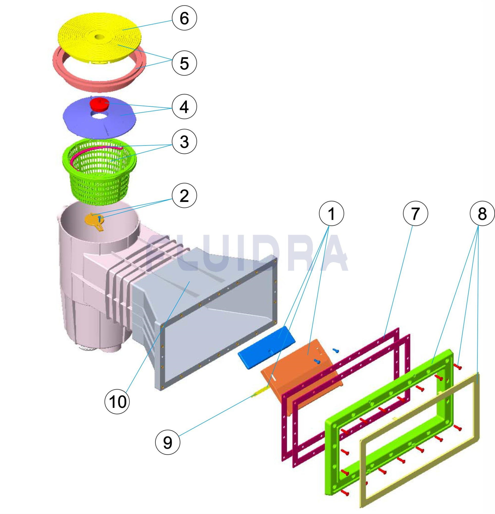 Подложка и преф. басейн - 15 L Скимери • Всички компоненти, които са изложени в тази гама скимери, са с UV обработка. • Изработени от ABS, те се доставят с преградна клапа и възвратен клапан на регулатора на потока. • Връзка на долната смукателна дюза: 11/2" вътрешна резба, 2" външна резба. • Едновременно свързване към главния отвод: Ø 50 mm вътрешна стена. • Преливна връзка: Ø 40 мм. • Капан за листа. • Препоръчителен дебит: 7,5 m3/h. • Препоръчително е да се инсталира един скимер на всеки 25 m2 водна повърхност. • Всички скимери се предлагат в два различни модела: модел с вложки и модел PARKER, който се доставя със самонарезни винтове. Доставя се със залепващи уплътнения, фланец и винтове.