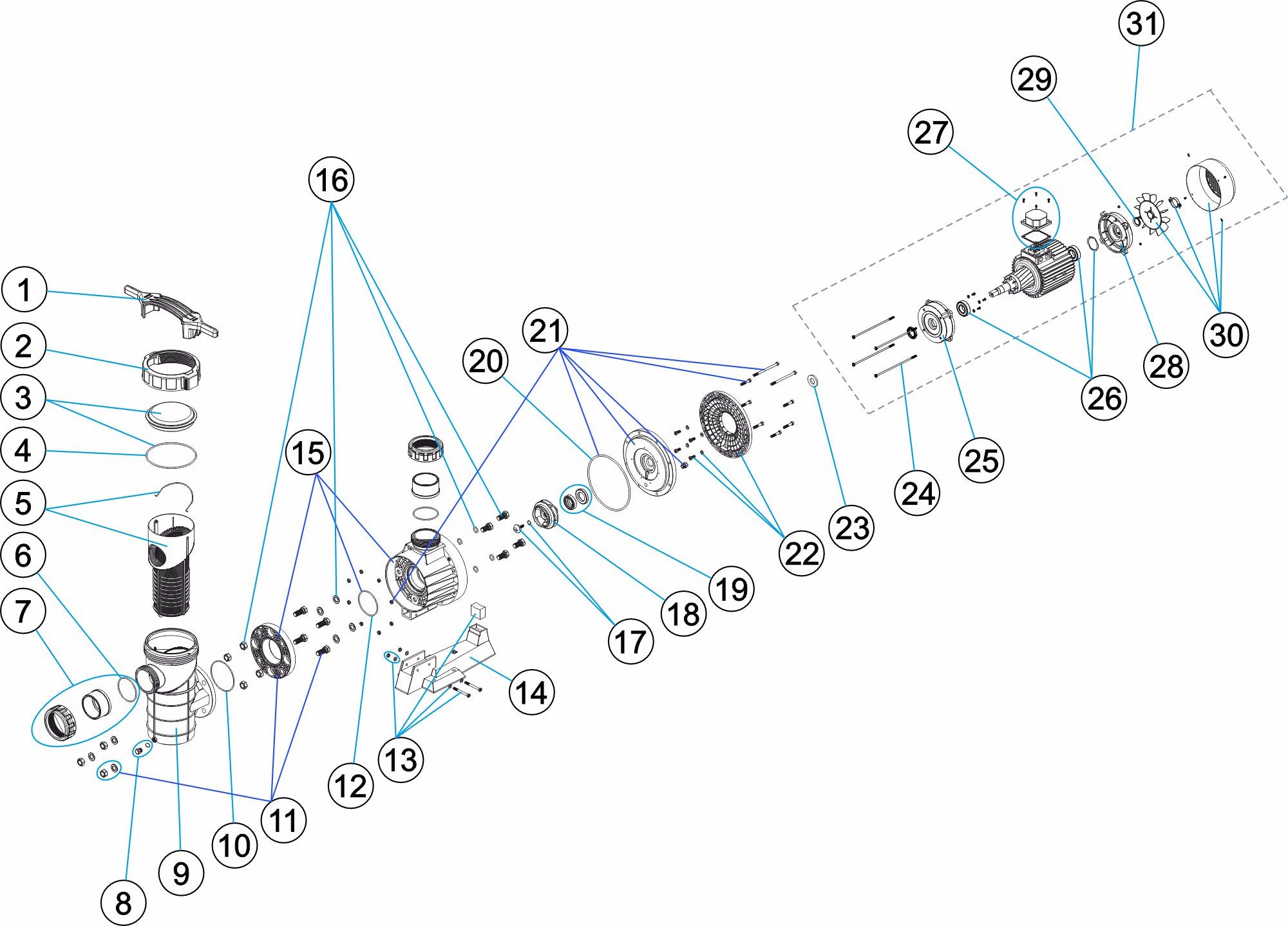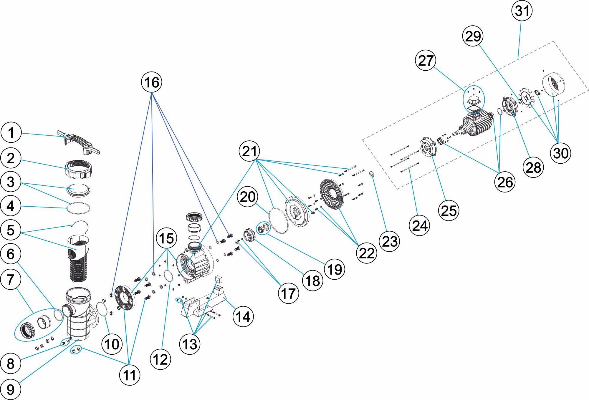 Помпа 2.860 об./мин. Максим. Корпус на помпата и опори от пластмасов материал, накрайник на вала на двигателя от неръждаема стомана AISI-316 с двойна изолация. Защита на двигателя IP-55. Предфилтърна кошница с капацитет 8 литра. Прозрачен капак на предфилтъра. Резба на свързване 3".