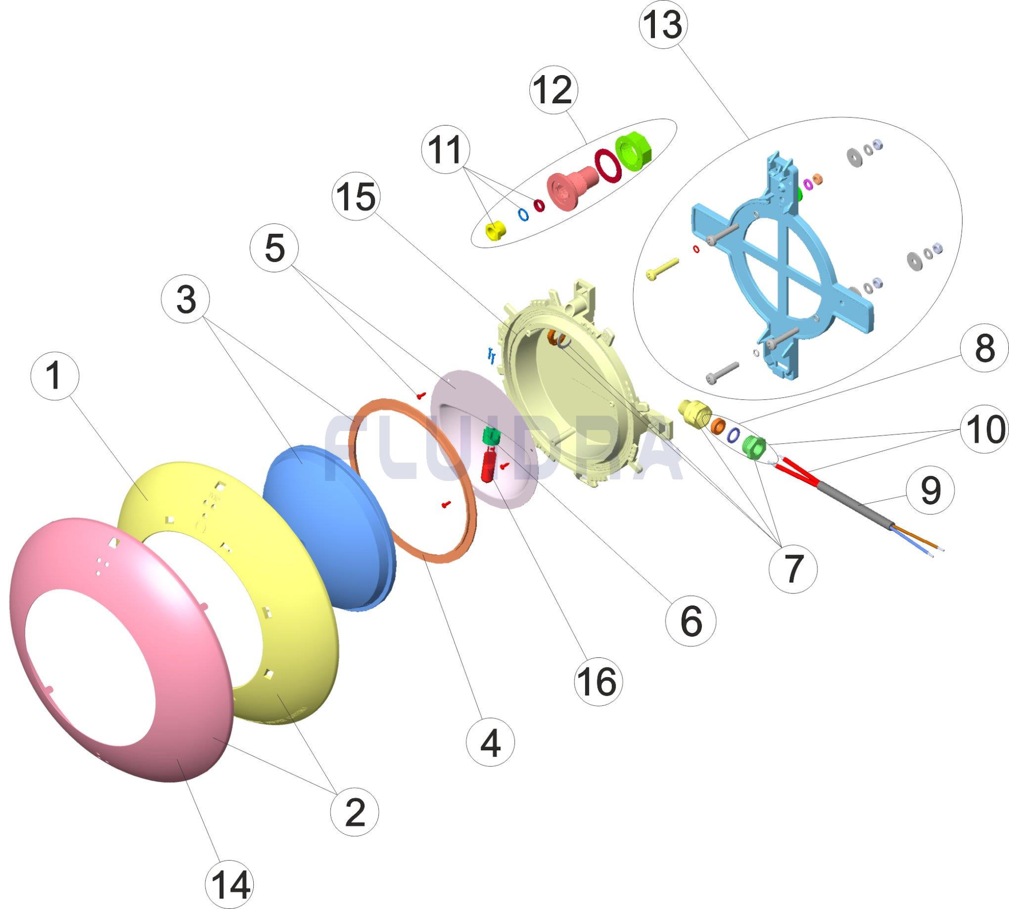 100 W, 12 V подводна светлина. (Не изисква ниша). Изработена от термоустойчива пластмаса. Кръстовидно подсилено пластмасово фиксиране с помощта на дюбели, винтове и уплътнения. Доставя се с 2,5 m кабел. 100 W, 12 V халогенна крушка. Доставя се без трансформатор. Предлага се с пластмасова лицева плоча от ABS или S.S.