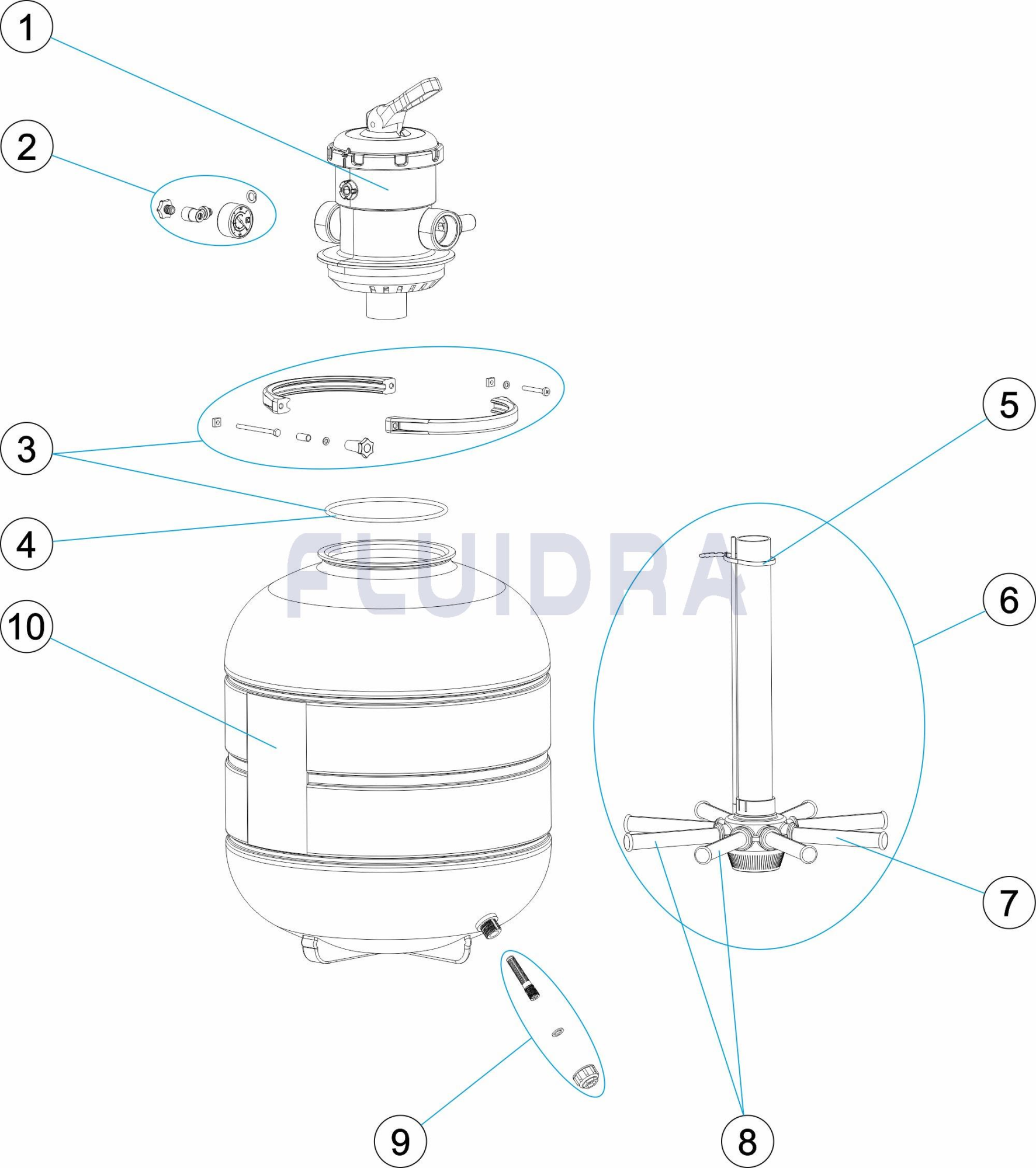 Филтрите са формовани чрез раздуване в едно цяло без свързване или заваряване. • Произведен от пластмасова смола, непроменена от химически и атмосферни агенти. • Лесно отваряне на капака. • Снабден с манометър, ръчно прочистване на въздуха и водата и многопътен вентил. • Цвят слонова кост. • Максимално налягане от 2,5 kg/cm2 за филтри Ø 430 mm и Ø 480 mm и 2 kg/cm2 за филтри Ø 560 mm и Ø 660 mm. • 1½" вентил