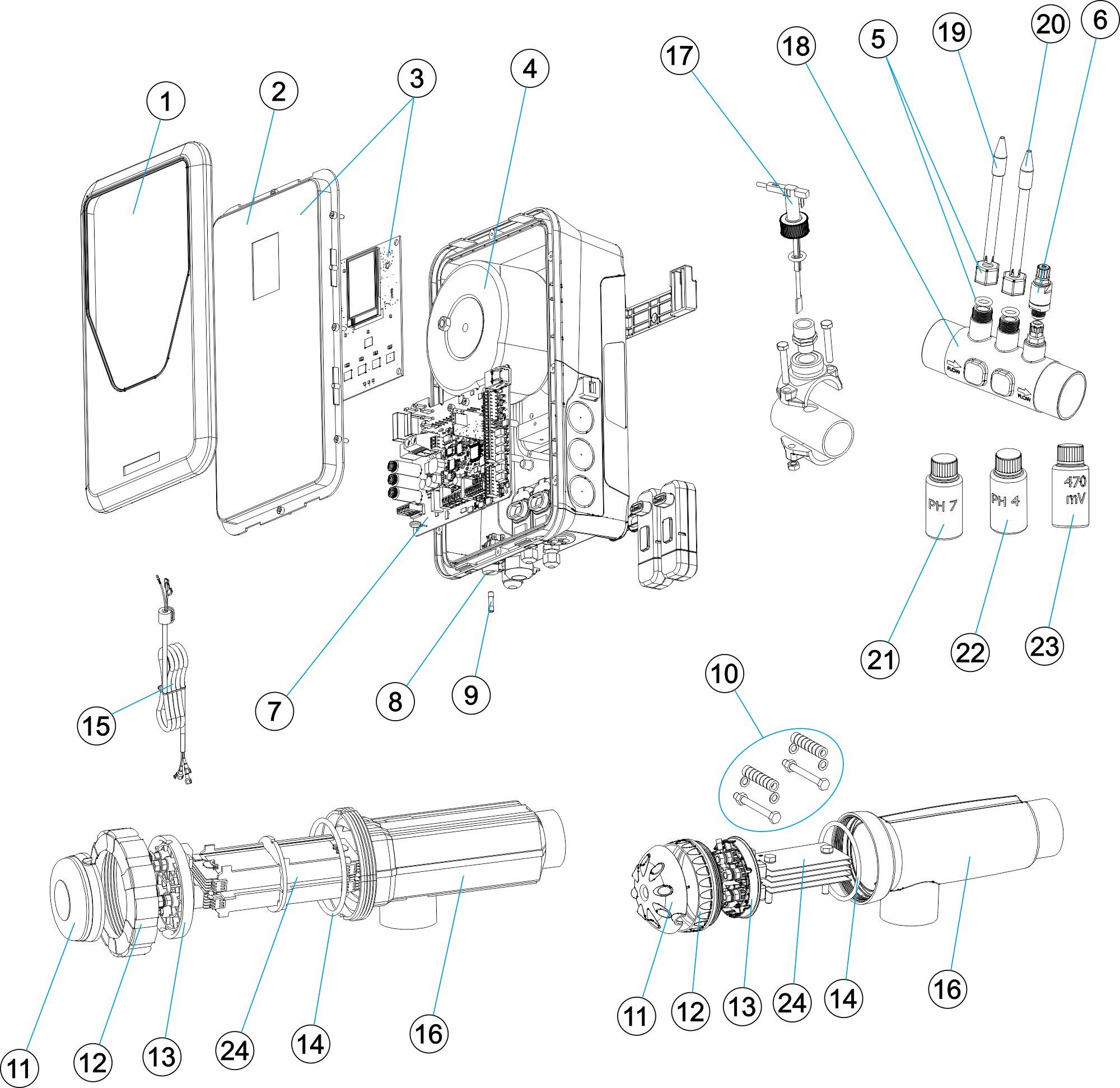 Elite Connect. Цялостно и автоматично оборудване за контрол на pH и хлора в басейна чрез добавяне на предимствата на електролизата на солта. • Продуктът е свързан чрез вътрешния Ethernet порт и приложението PoolStation (достъпно за iOS и aOS). • Съвместим с NN: Интелигентен контрол в автоматизацията на Fluidra Connect и приложението NN (достъпно за iOS и aOS). • Мащабируеми контролни функции чрез S-Driver® plug-in модули (pH, Rx или Cl ppm). • 2.8" TFT цветен сензорен контролен панел. • Съвместим с Fluidra Connect и интегриран PoolStation. • Разполага с 4 цифрови входа и 4 цифрови изхода (релета) за управление на филтрираща помпа, термопомпа, осветление, поливна система, поливна система и др. • Стандартно оборудван с детектор за газ, превключвател на потока и компактен държач за сонда (pH опция). • Оборудван с висококачествени електроди, с живот до 12 000 часа при нормални условия. • Производствен контрол от 0 до 100%. • Помпа за дозиране на pH, включена в опцията за pH. • Версия с ниско съдържание на сол (1-4 g/l). • Ново: Интелигентен потребителски интерфейс и разширени функции: • 1) Сензорен екран с подобрена информация за по-лесно четене (нов фърмуер). • 2) S-Driver модул за управление на повечето 3-скоростни помпи с променлива скорост. • 3) Нова релейна кутия за лесно окабеляване за управление на оборудването на басейна. • 1 10 A изход за филтърна помпа (до 3 HP) и 3 6,5 A изхода за всяко електрическо устройство. • Шкафът за захранване и управление Elite Connect се предлага на страница 372 за лесен монтаж.