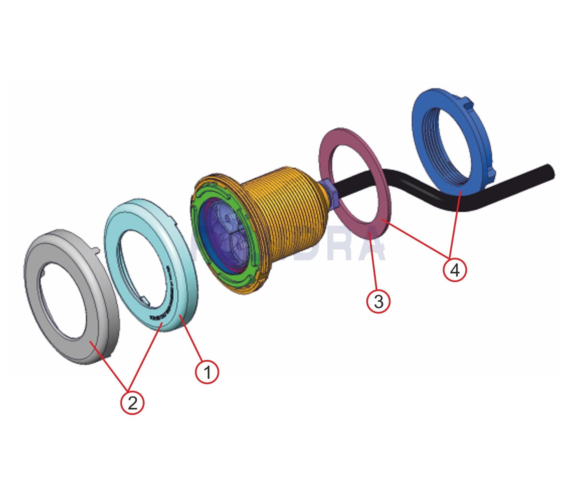 За правилно осветяване на басейн е препоръчително да инсталирате проектор от гамата LumiPlus Mini V2 на всеки 5 m2 водна повърхност. NB: препоръките са валидни за светли басейни и проектори с бяла светлина; овърсайз в RGB цветове. При басейни с по-тъмен цвят или басейни от неръждаема стомана препоръчваме да увеличите съотношението на проекторите на m2. Номинално напрежение: 12V AC. IPX8 защита. Включва 2,5 m кабел H07RN-F 2x1,5 mm2. Закрепен между болт с резба и гайка 2”. Консумация: 4W (7VA) Светлинен поток: 186 lm