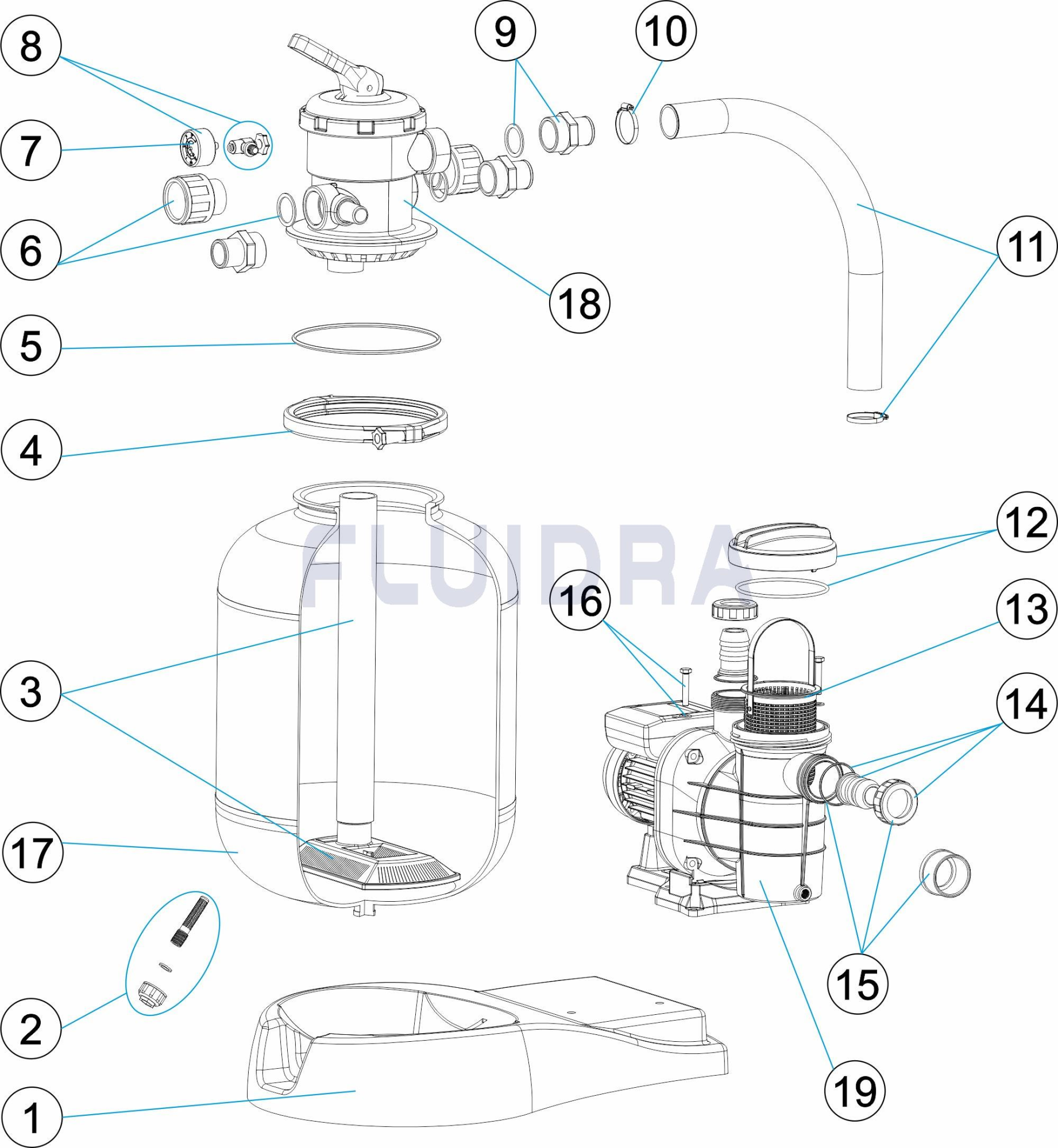 Галактически моноблок. Филтър, изработен от високоустойчива термопластична раздувна пластмаса. Включва 6-пътен многопортов селекторен вентил, манометър, ръчно обезвъздушаване, обезводняване, компактна самозасмукваща помпа, с електрически кабел и щепсел, маркуч, фитинги, основа и аксесоари за пълно сглобяване. Максимално работно налягане 2,4 бара. Включени фитинги, D38 и D50 mm, за максимална гъвкавост на монтажа. Отговаря на изискванията за филтриране съгласно EN 16713-01.