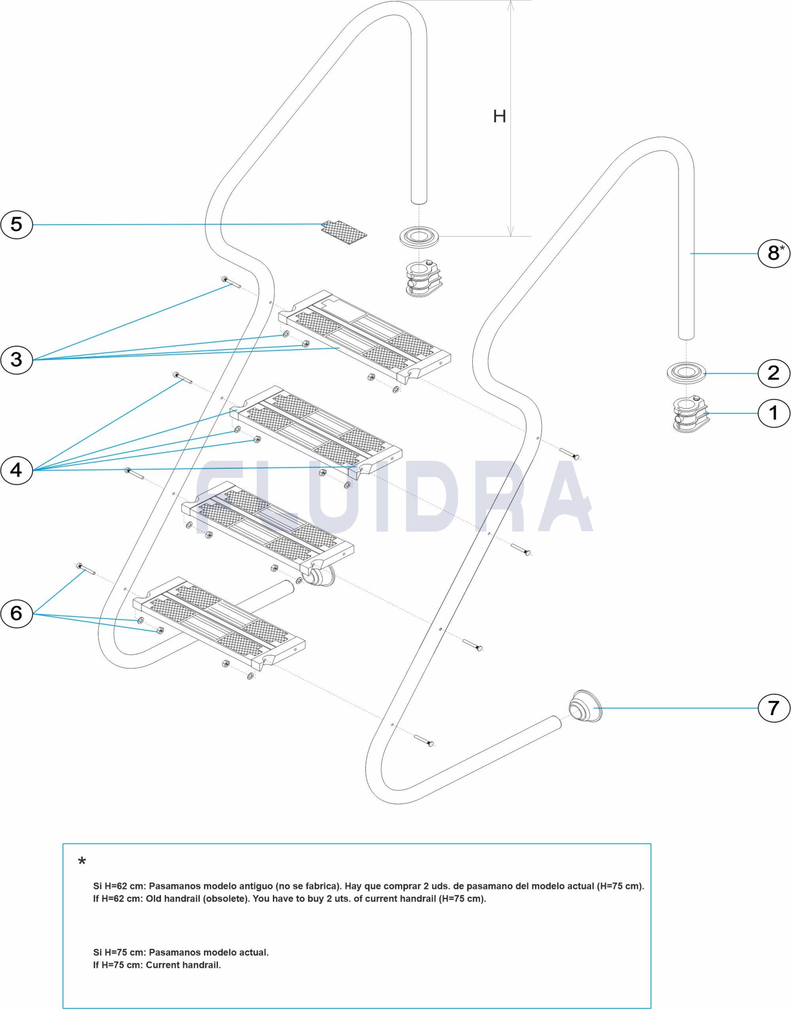 Ladder width of 500 mm. Handrails in polished stainless steel (Ø 43 mm) pipe. With anchoring fixtures and earthing connection. Polished finish. With anchoring fixtures for earth connection. Rails and non-slip steps in polished AISI-316L.