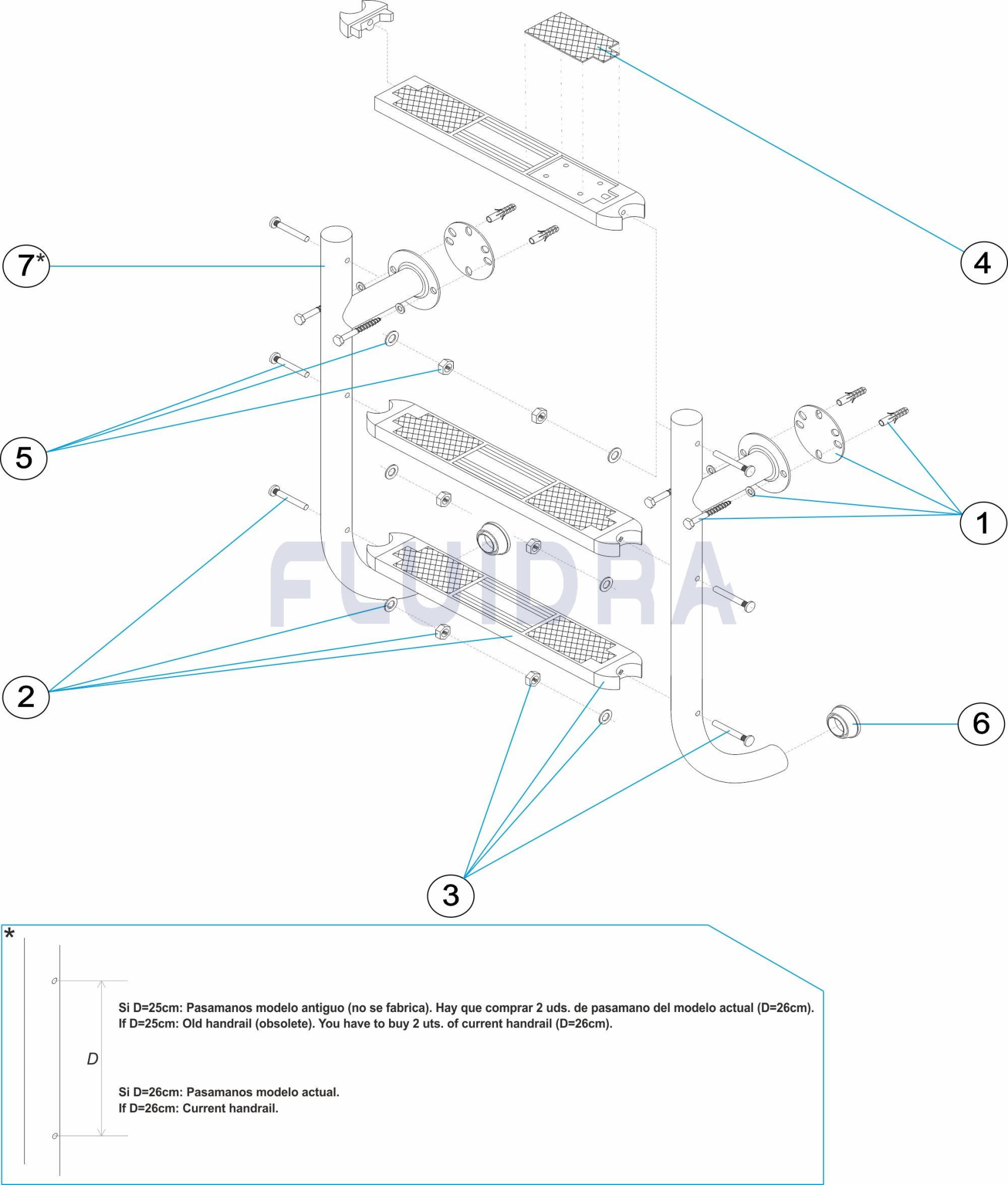 Rails and steps in polished AISI-316L stainless steel (Ø 43 mm). Attachment with fixing plates, gaskets, screws and wall plugs. To connect ground earth cable use Equipotential Anchor items 73318 or 73319.