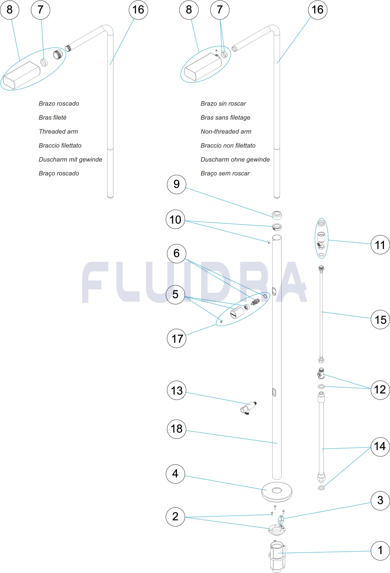 AISI-304 polished stainless steel (Ø 43 mm) shower with 1 chrome anti-limescale showerhead and 1 flow opening valve. Includes footwash tap. With 00107 anchoring fixture incorporated