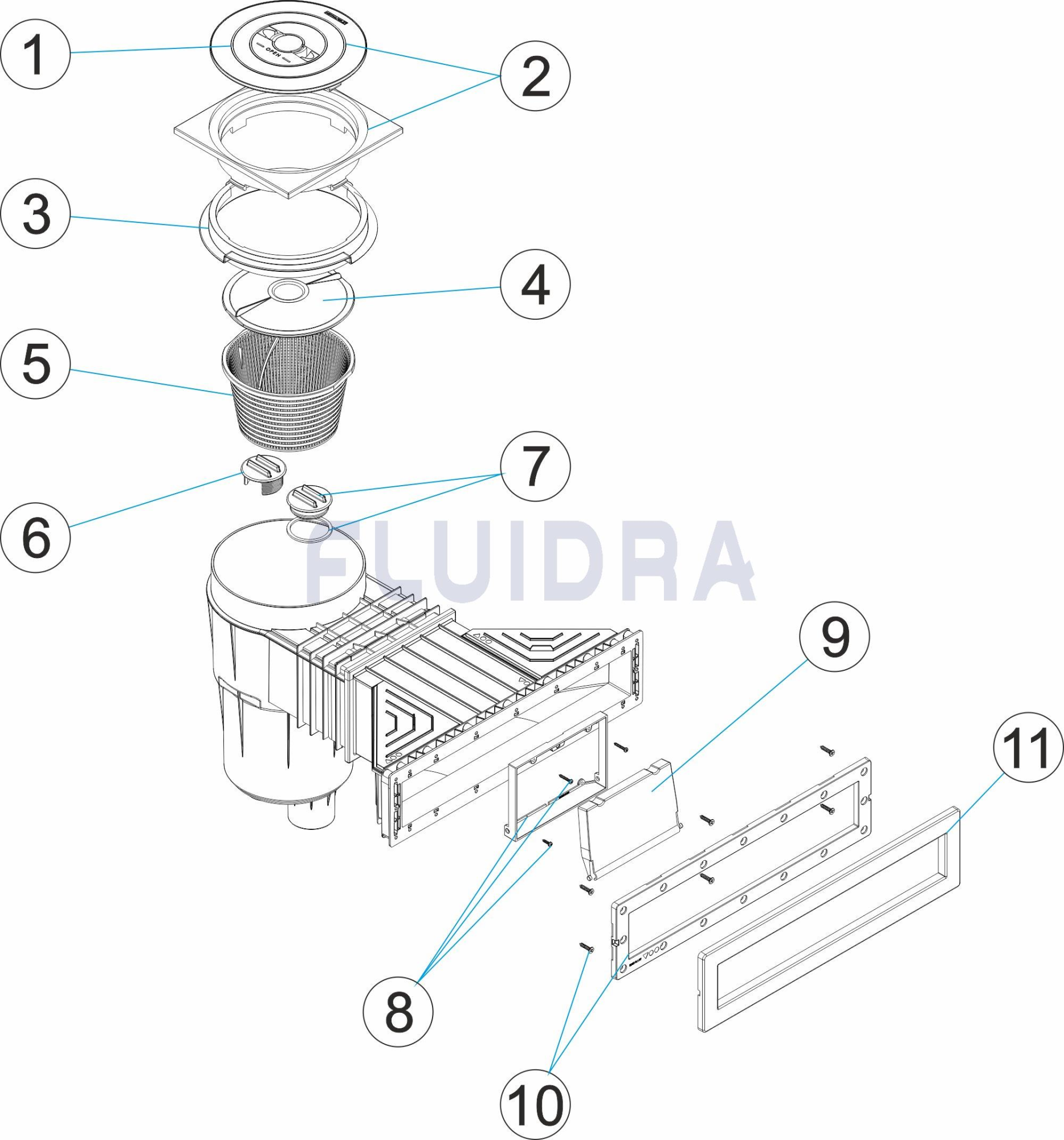 17,5 L skimmer range suitable for installation in public and private pools. Manufactured in ABS with UV treatment, it comes with a weir flap, Flow regulator plug, lid height adjustment and basket. The water inlet is 495 x 80 mm. Recommended flow rate of 7.5 m3/h. Install one skimmer every 25 m2 of water line surface area.