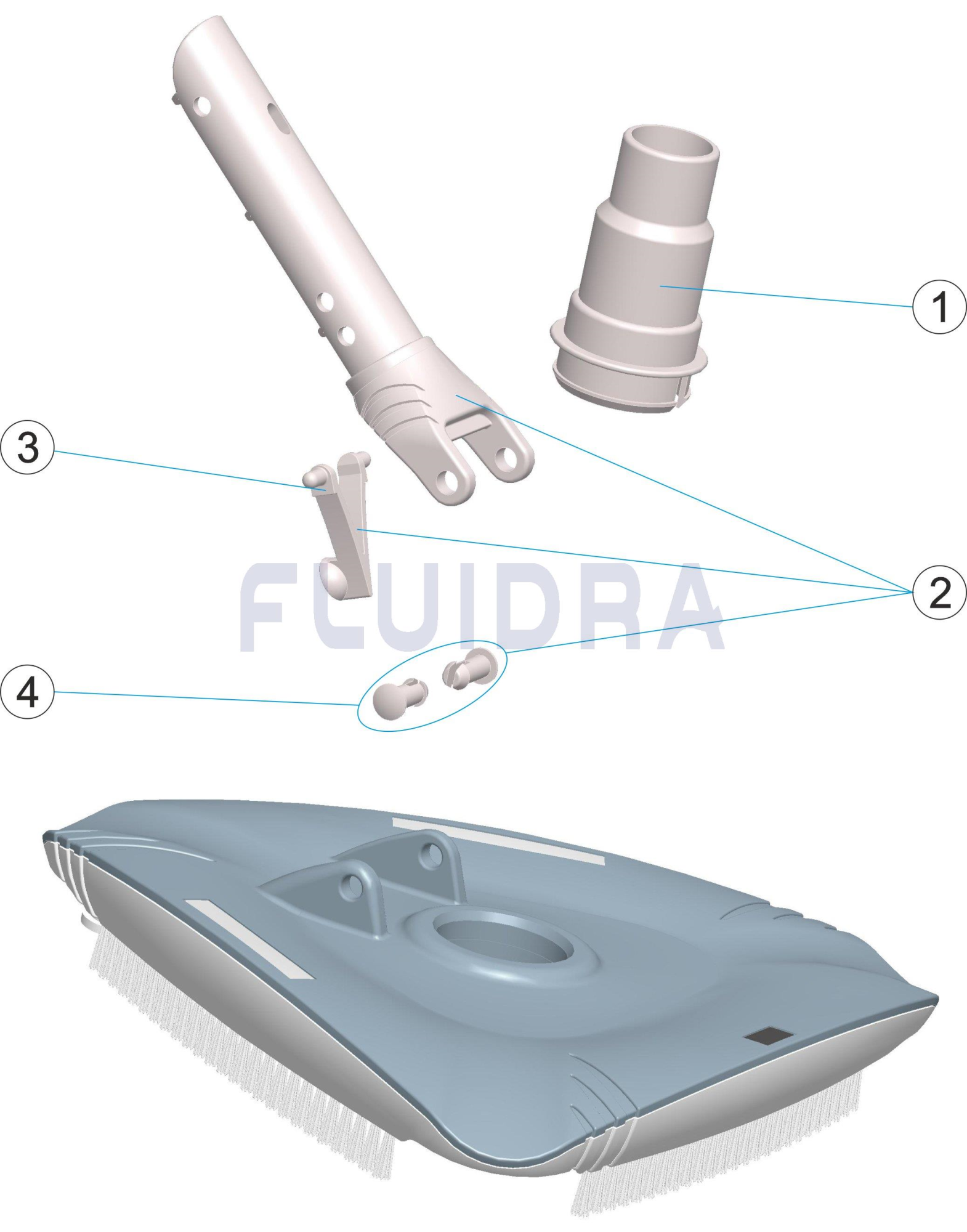 Manufactured in ABS, this model features a hose connection with a choice of two diameters (Ø 32-38). It can be fixed to a telescopic pole through wishbone or wing-nut fixing. The brush is made from white polypropylene.