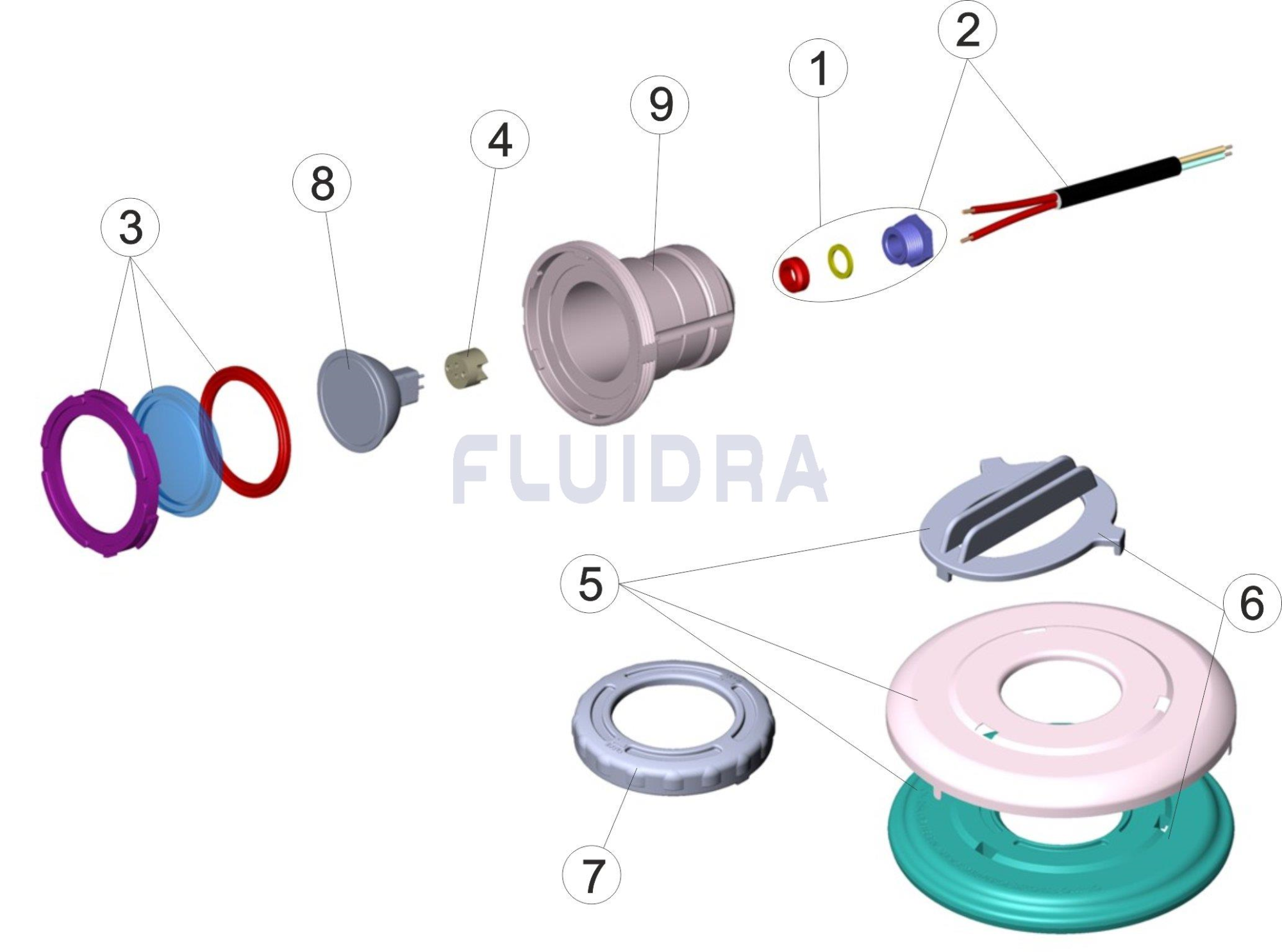 Manufactured in PA and ABS plastic materials. Supplied with 2.5 m cable of 2 x 1.5 mm2. Without screws, bayonet system on both the trim and the housing. Easy to dismantle using the trim outer as a key to change the lamp. Aluminised 50 W-12 V halogen lamp and 38º opening of 95 lux light beam at 4 m distance with an illuminated circle of 2.5 m. Possibility of attaching colour lenses to the trim outer. Light supplied without transformer. Available in white ABS faceplate or S.S.