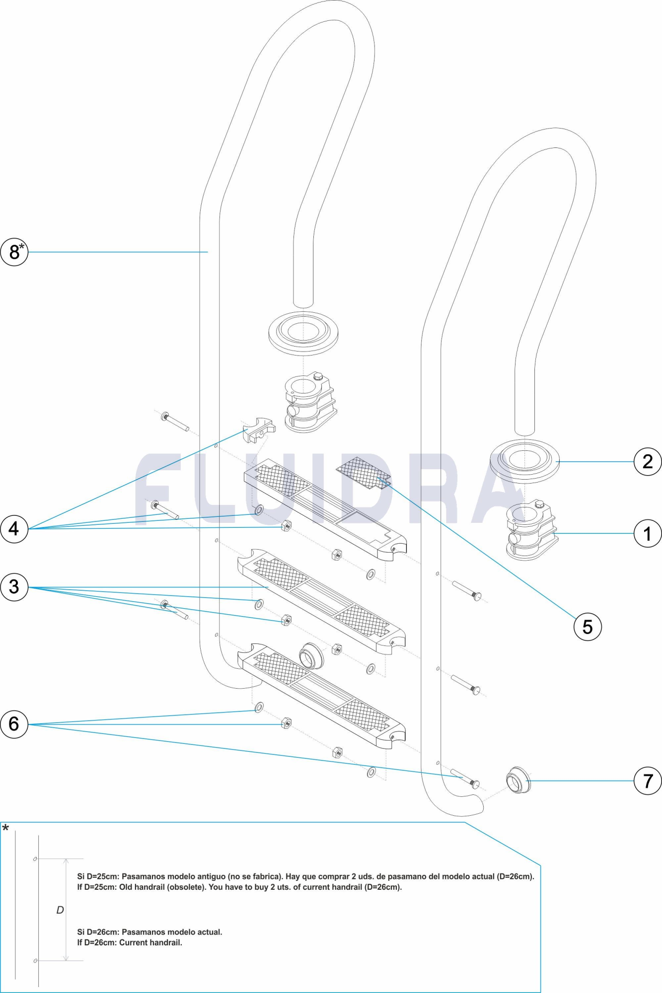 Ladders with Mixta models handrails for embedded pool. Handrails manufactured in Ø43mm hand polished stainless steel tube. Steps in stainless steel. Its accurate and safety design avoids the possibility of slipping or cutting. Complete with fixing anchors and earth connection.