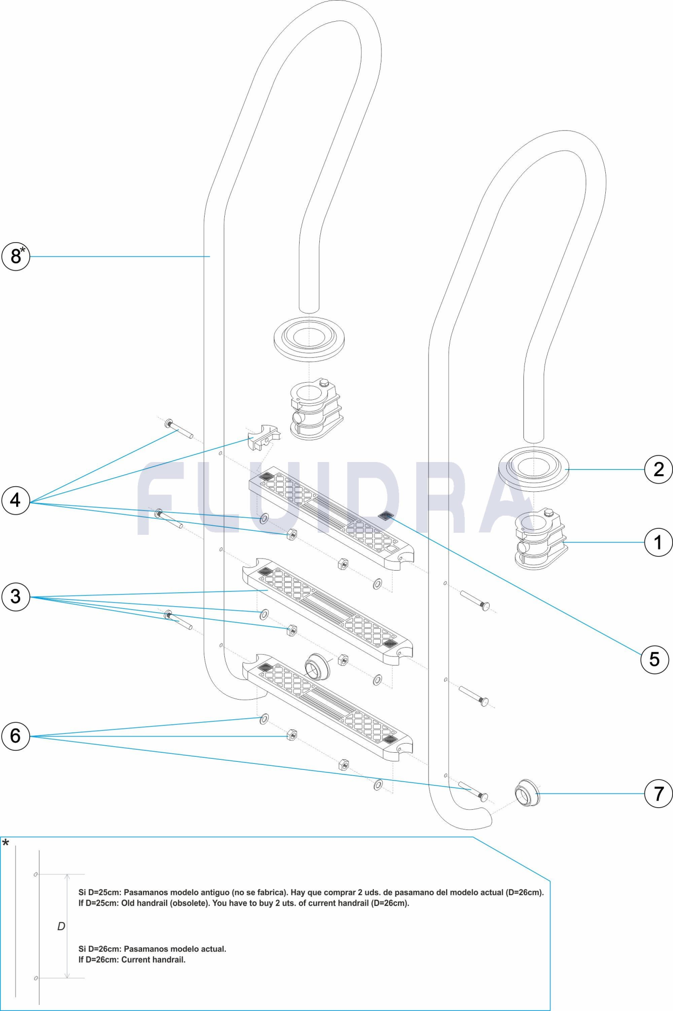 Ladders with Mixta models handrails for embedded pool. Handrails manufactured in Ø43mm hand polished stainless steel tube. Steps in stainless steel. Its accurate and safety design avoids the possibility of slipping or cutting. Complete with fixing anchors and earth connection.