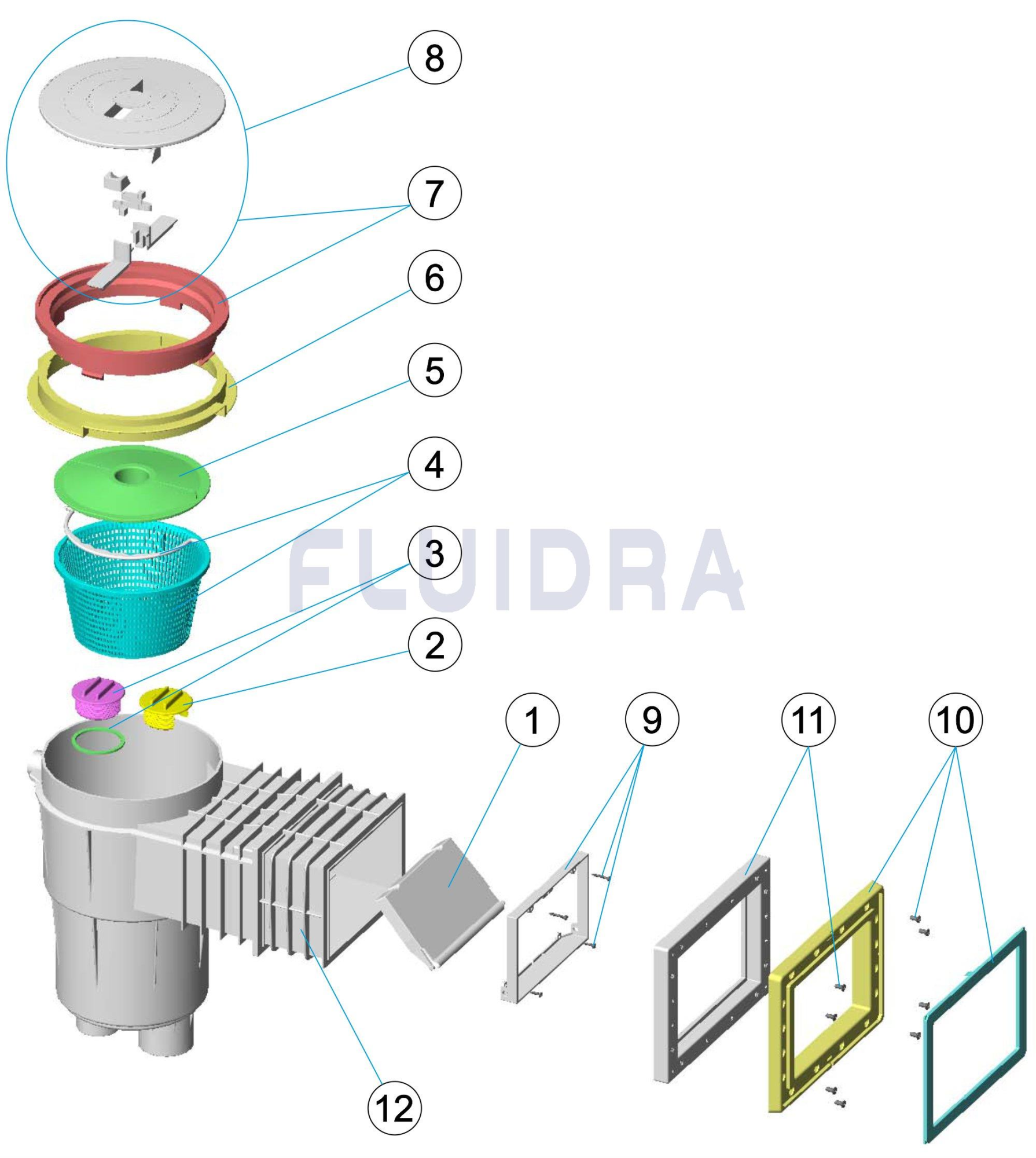 • Leaf trap secured to base by means of a bayonet mount. In-built weir flap housing. Recommended flow rate: 7.5 m3/h.