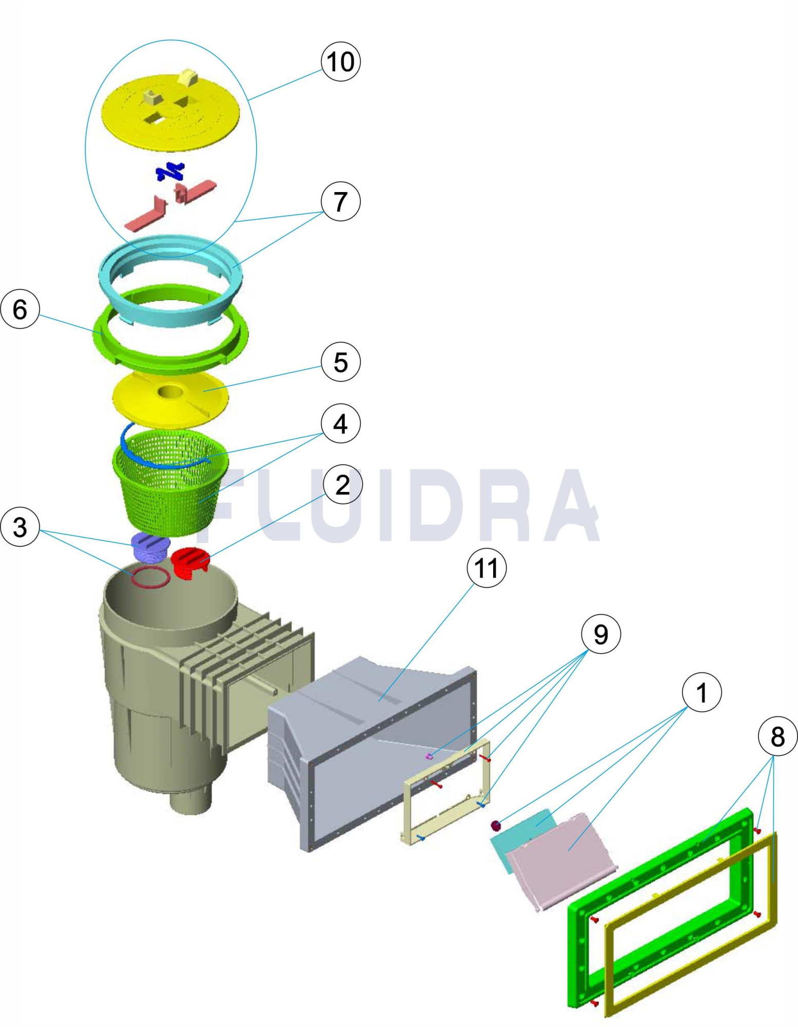 • Leaf trap secured to base by means of a bayonet mount. In-built weir flap housing. Recommended flow rate: 7.5 m3/h.