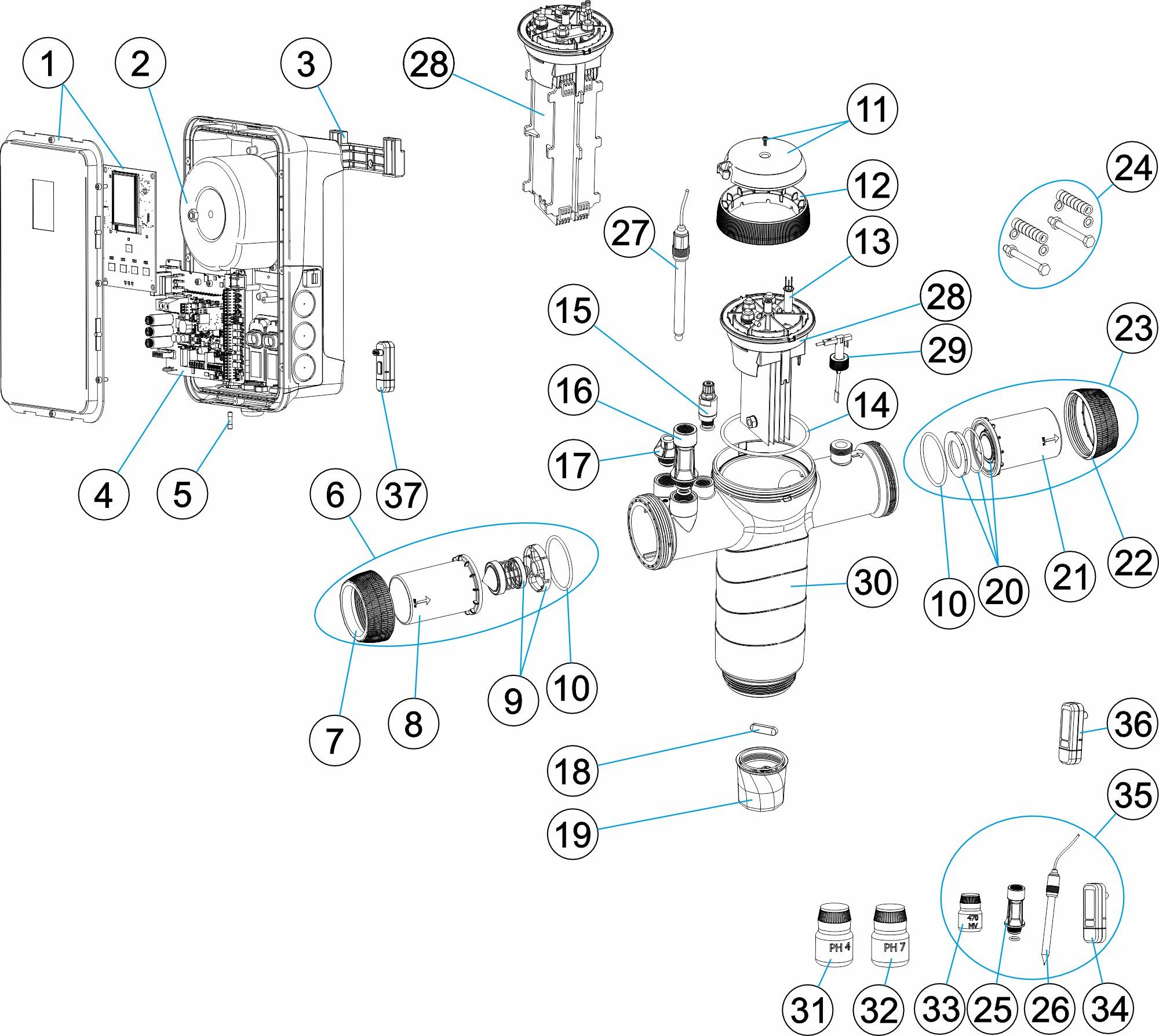 • Funciones de control escalables mediante módulos enchufables S-Driver (control de pH, ORP o cloro activo y VS oump).