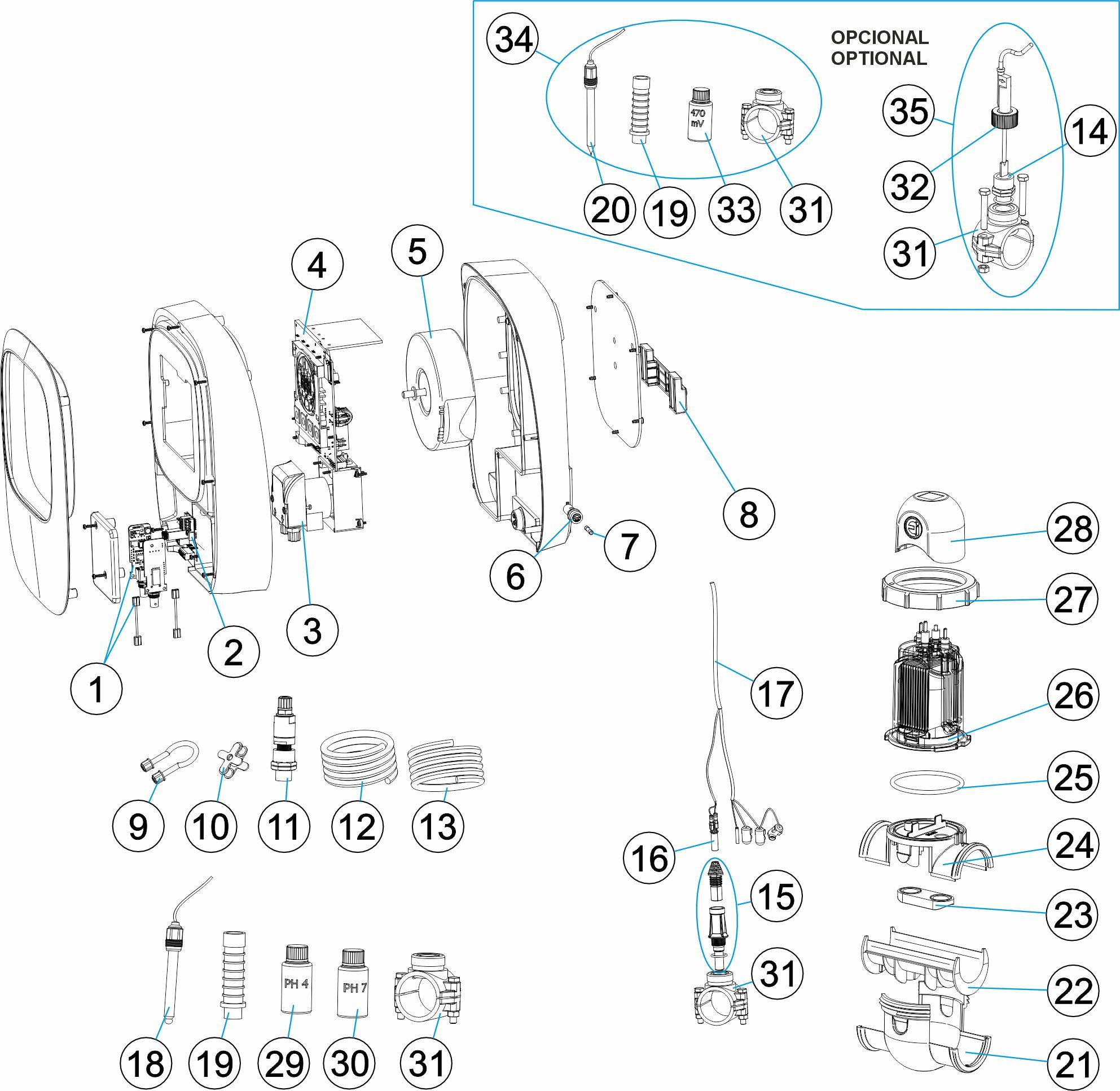 • Disponible en versión evolutiva que incluye regulación de pH y kit ORP listo para usar para un tratamiento completo del agua (versiones Evo)