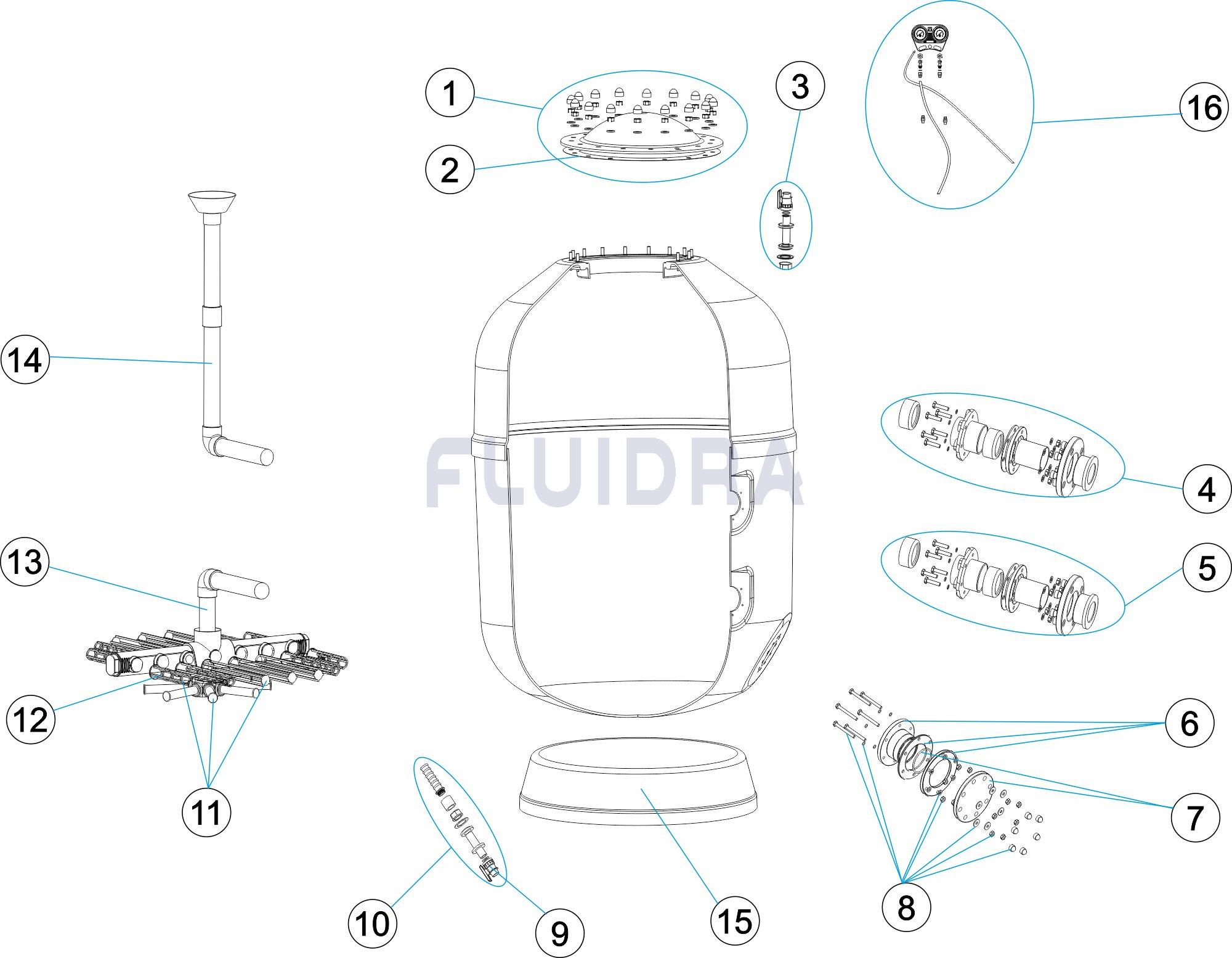 Fabricados en poliéster y fibra de vidrio. Equipados con manómetro, purgas de aire y agua manuales y tapa de Ø 400 mm. Aptos para velocidades de filtración de 20, 30, 40 y 50 m3/h/m2. Consultar por otras velocidades. Todos los filtros pueden montarse con batería de válvulas. Modelos disponibles para un altura de lecho de 1 m y 1.2 m, y para aguantar presiones de hasta 2.5 Kg/cm2 y de hasta 4 Kg/cm2.
