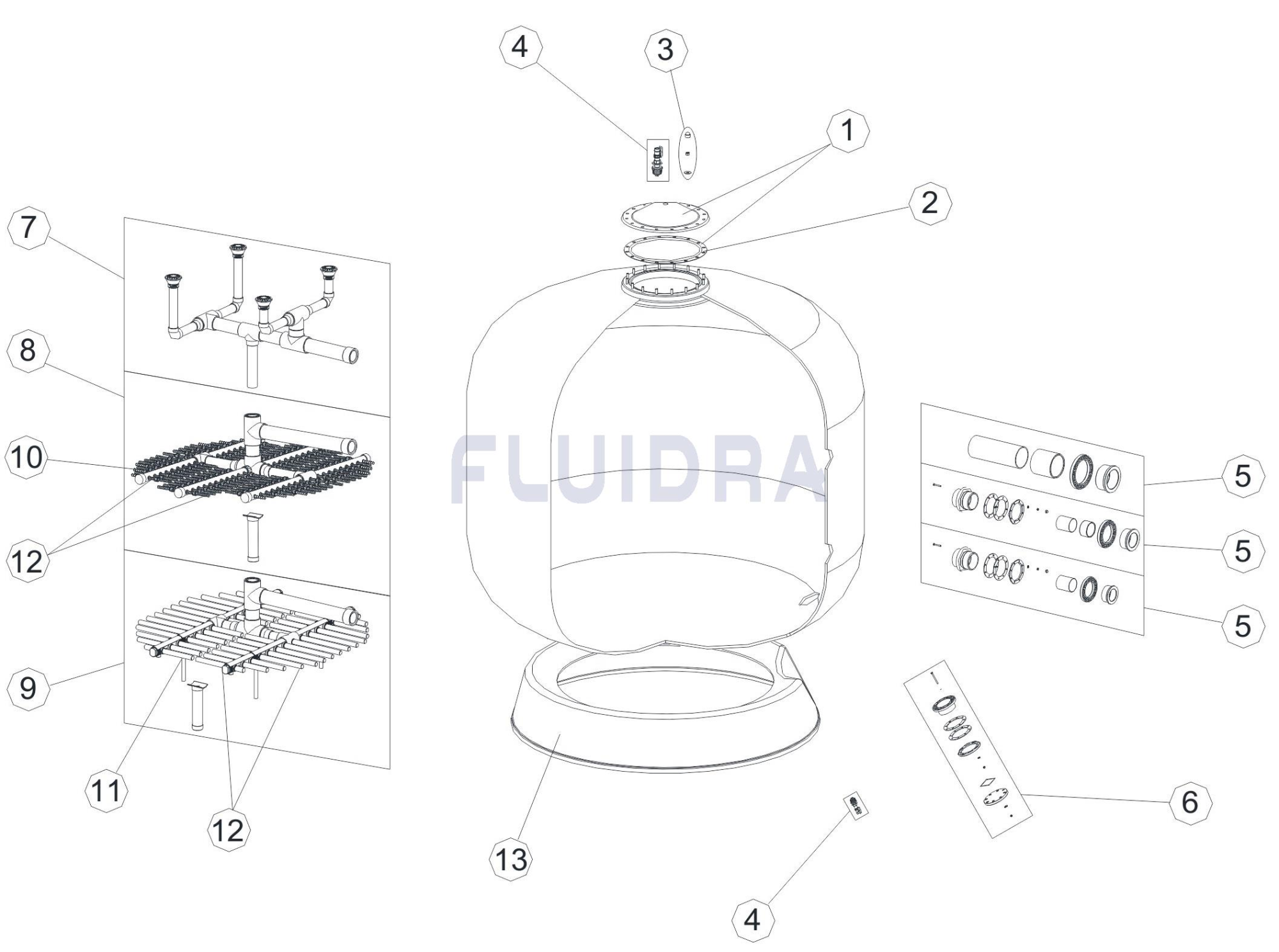 Filtro monocapa de poliéster y fibra de vidrio. Tapa Ø 400 mm. Equipados con panel de manómetros, purgas de aire y agua manuales y tapón de vaciado. Aptos para velocidades de filtración de 20, 30 y 40 m³/h/m². Otras velocidades consultar.