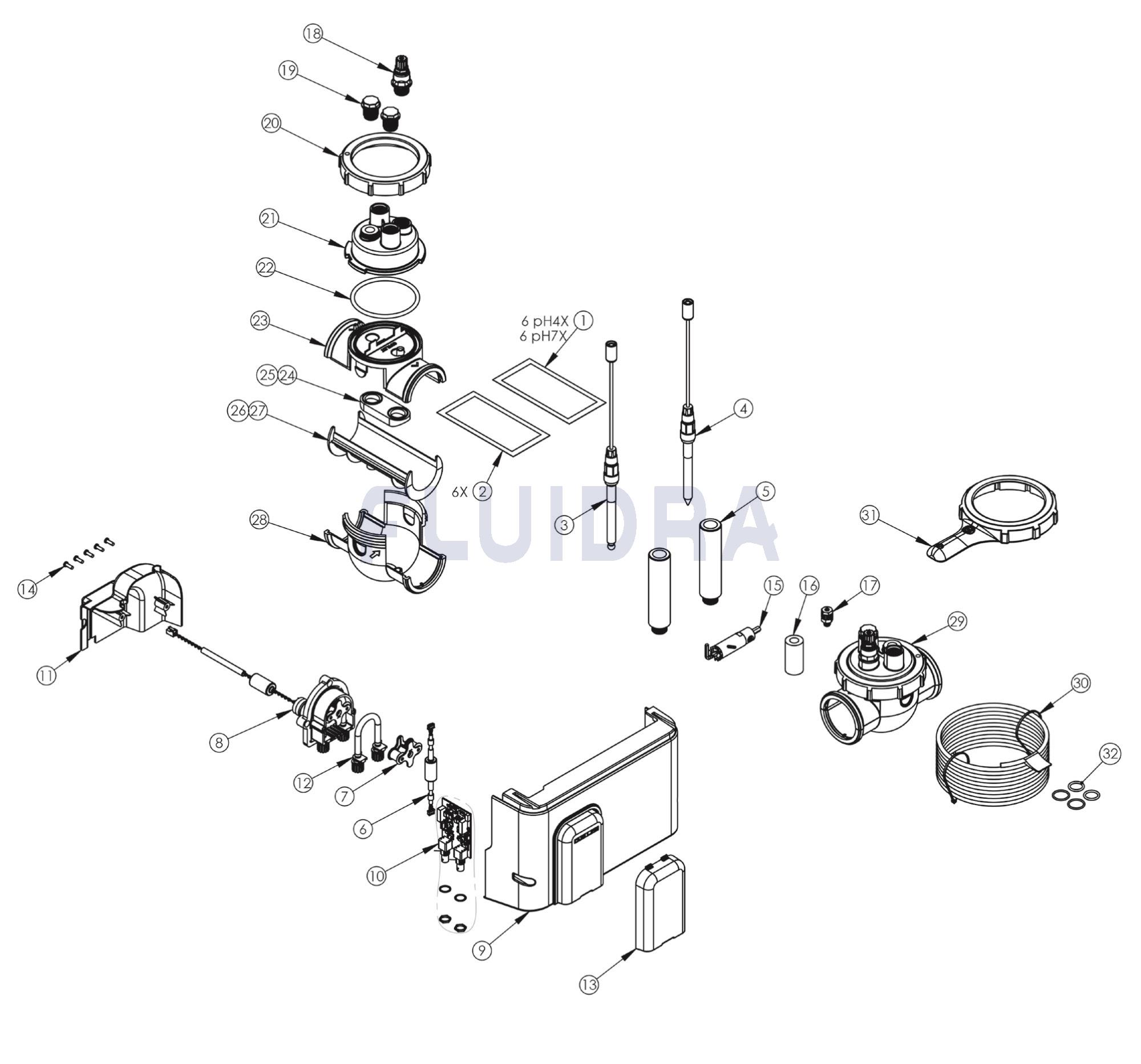 • Garantía de 2 años excepto consumibles, garantía de 1 año (sondas ORP, soluciones tampón Redox, manguito peristáltico, manguito inyector)