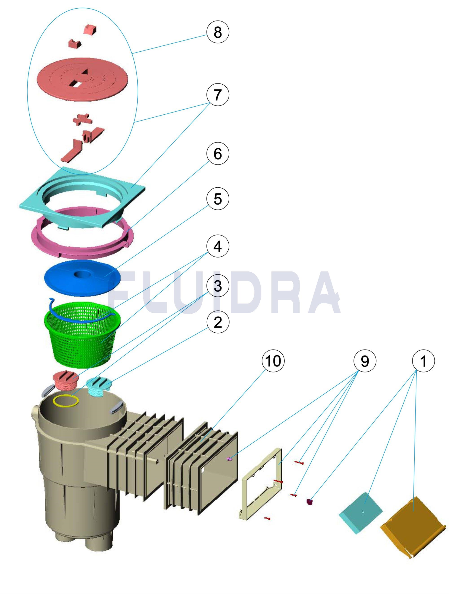 • Cesto recogehojas fijado a la base mediante cierre por bayoneta. Caseta con compuerta incorporada. Caudal recomendado: 5 m3/h.