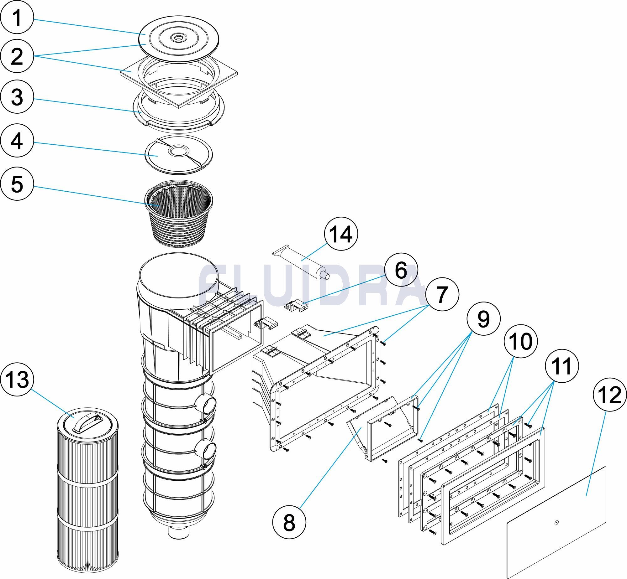 Incorpora compuerta, tapa reguladora de altura, cesto del skimmer y 2 filtros de cartucho.