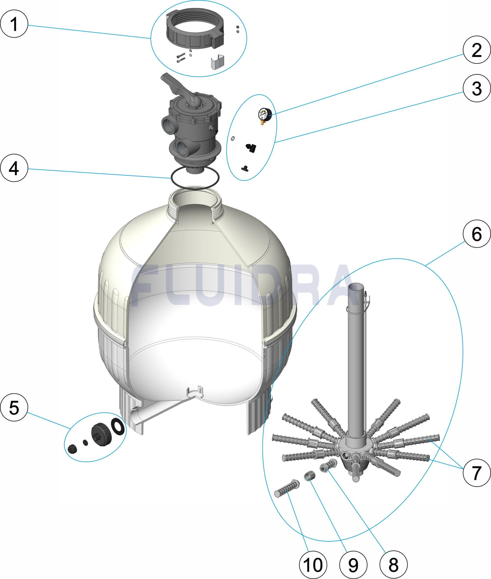 Filtros equipados con tapón de vaciado de arena de Ø 2’’ en los modelos Ø 750 mm y Ø 900 mm, y de 1 ½” en los modelos Ø 400 mm, Ø 500 mm y Ø 600 mm.