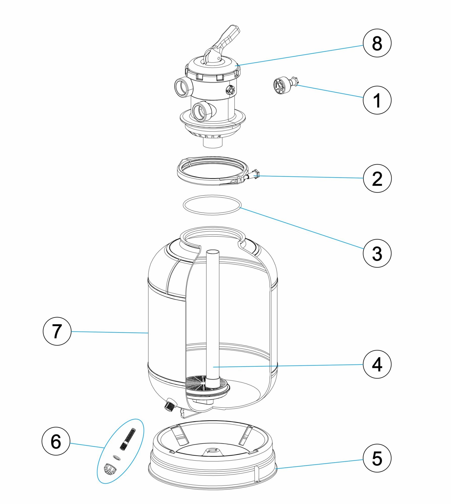 Blow-moulded range of filters from 6 to 14 m³/h for glass or sand media with top or lateral ports.