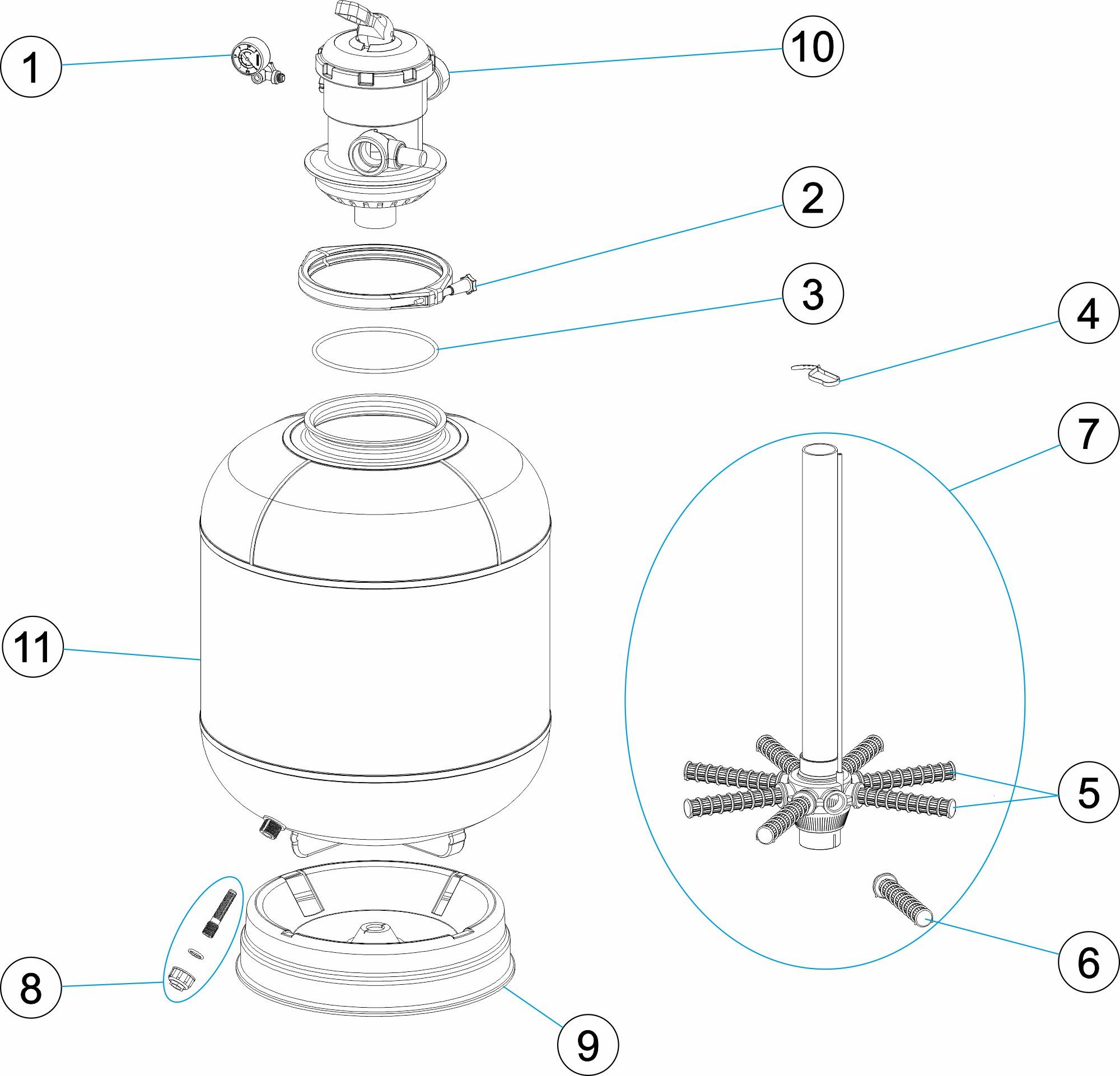 Blow-moulded range of filters from 6 to 14 m³/h for glass or sand media with top or lateral ports.