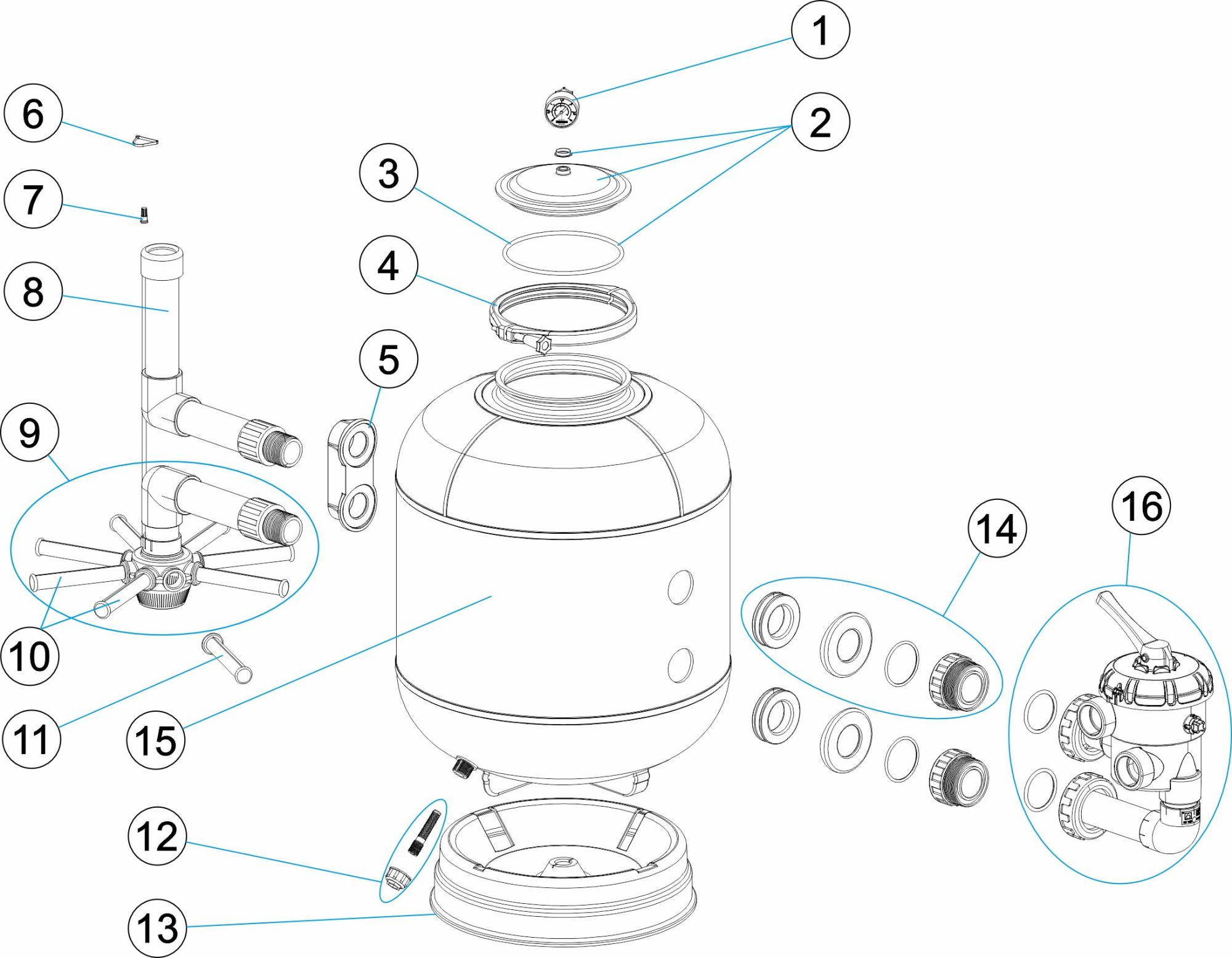 Blow-moulded range of filters from 6 to 14 m³/h for glass or sand media with top or lateral ports.