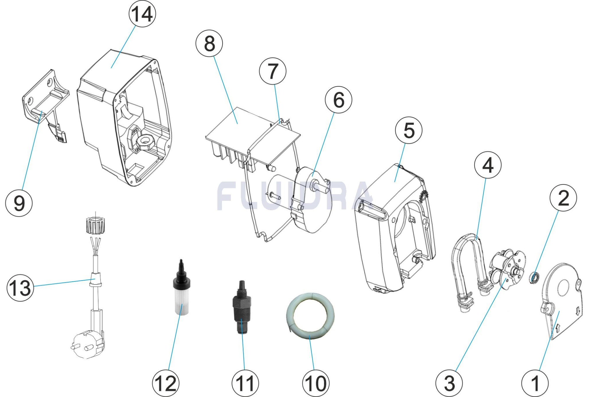 Bomba peristáltica com ajuste de fluxo de 0 a 100%. Dimensões: 137x90x109mm. O fluxo é controlado ajustando a velocidade do motor através de um potenciômetro localizado na frente da bomba. Composto por um interruptor ligado e desligado e um LED verde que indica que a bomba está funcionando. A tampa contém um rolamento para ter um melhor suporte do eixo.