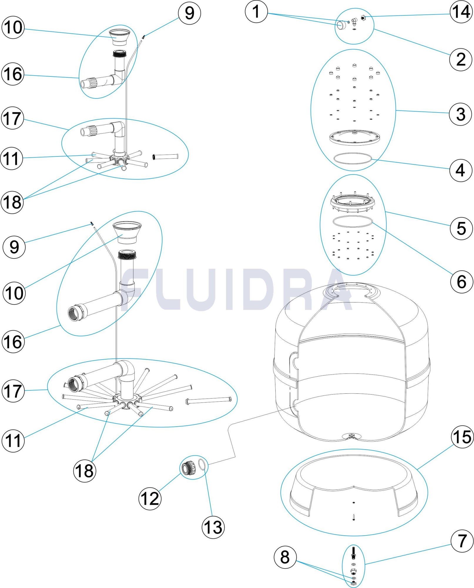Fabricado a partir de poliéster laminado com fibra de vidro, cor azul turquesa, equipado com manómetro e válvula de drenagem.