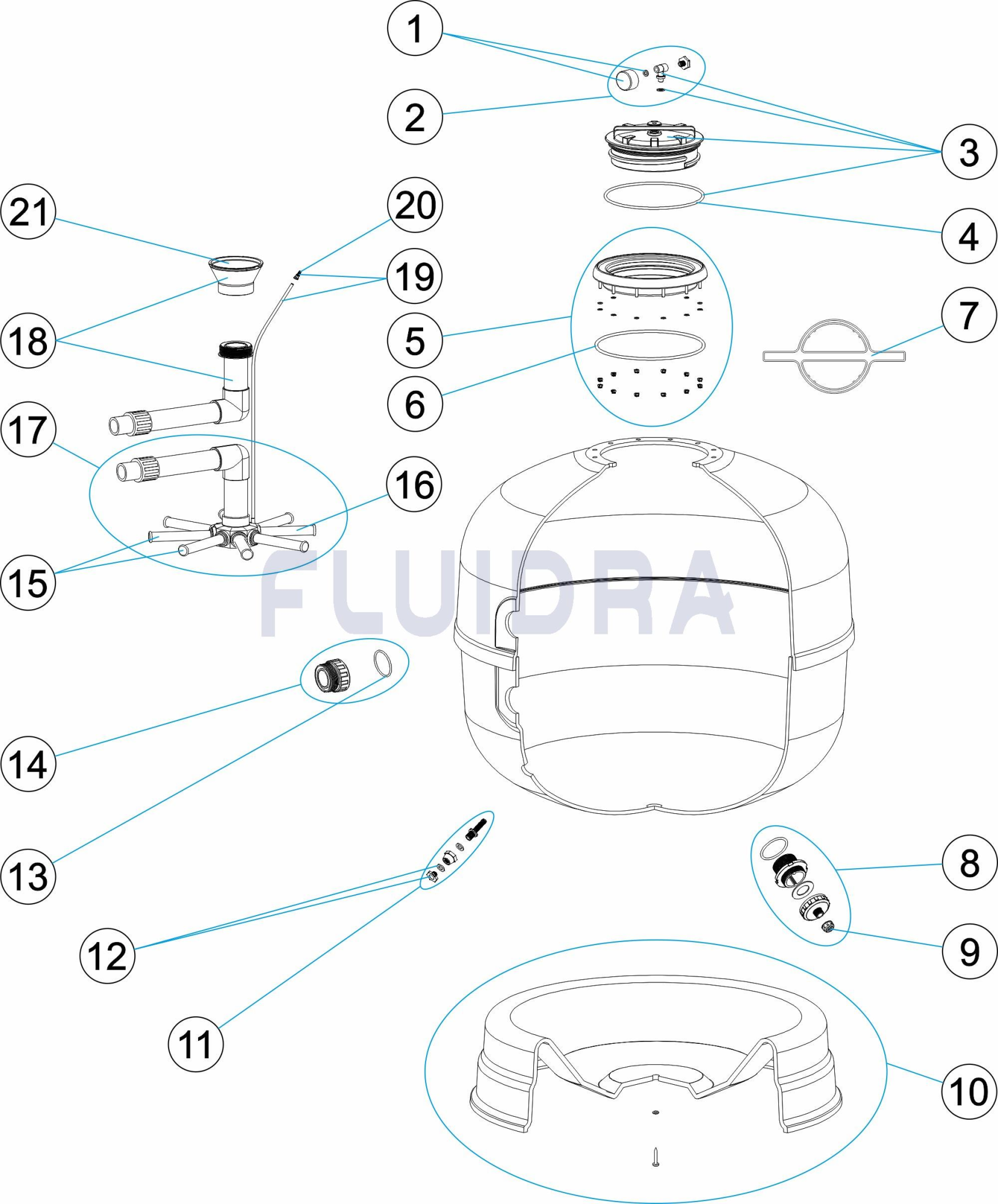 Corpo de filtro, em poliéster reforçado com fibra de vidro, de alto rendimento.