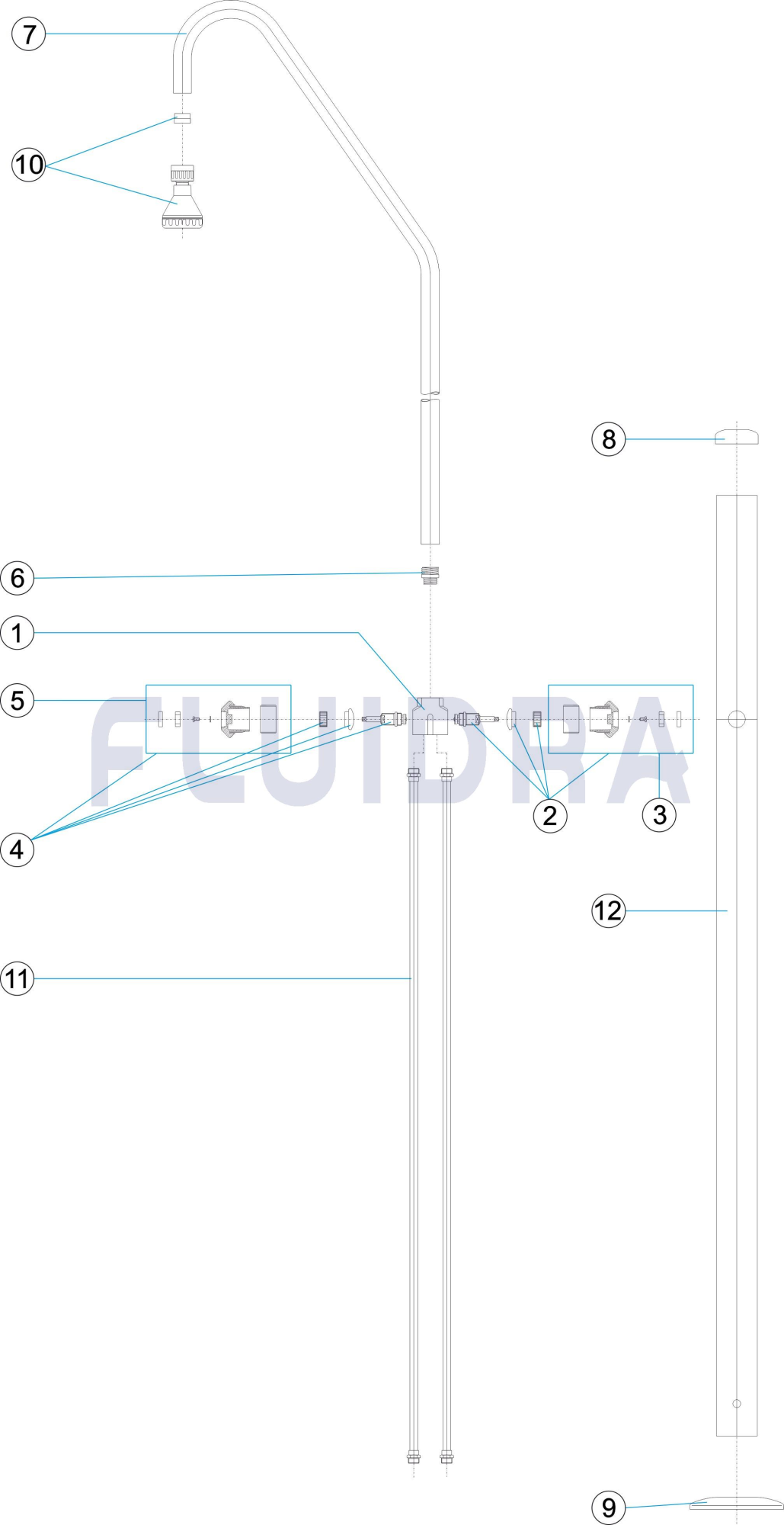 Chuveiro com 1 chuveiro e 2 válvulas (botões), para água fria e quente. Tubo de Ø 63 mm fabricado em S.S AISI-304. Nào pode ser equipado com âncoras. Altura ( do chuveiro ao chào) 2m.
