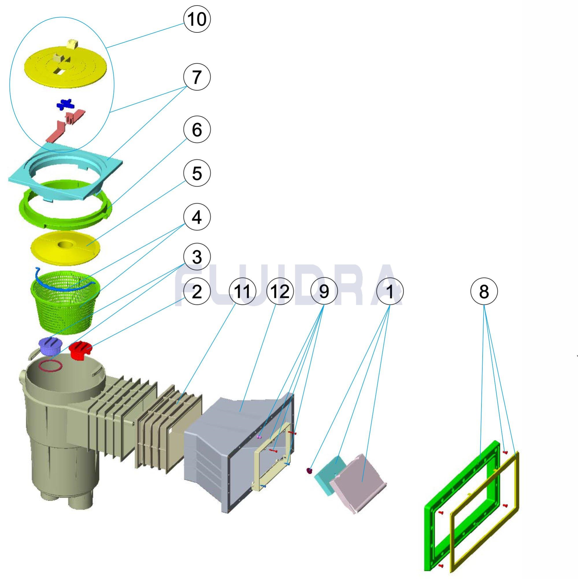 • Apanhador de folhas fixado na base por meio de um suporte de baioneta. Alojamento integrado para aba de comporta. Caudal recomendado: 5 m3/h.