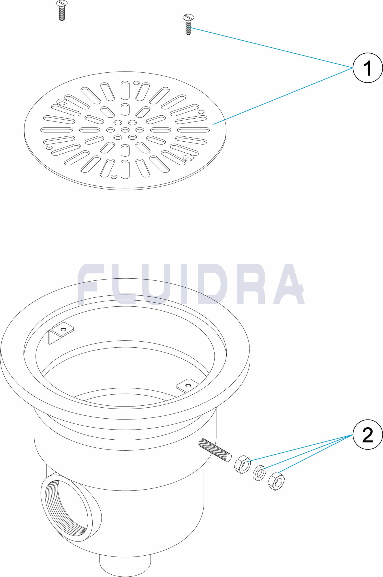 Saída lateral de 2". De aço inoxidável. AISI-316L. Grelha montada com parafusos. Caudal máximo: 13 m3/h.