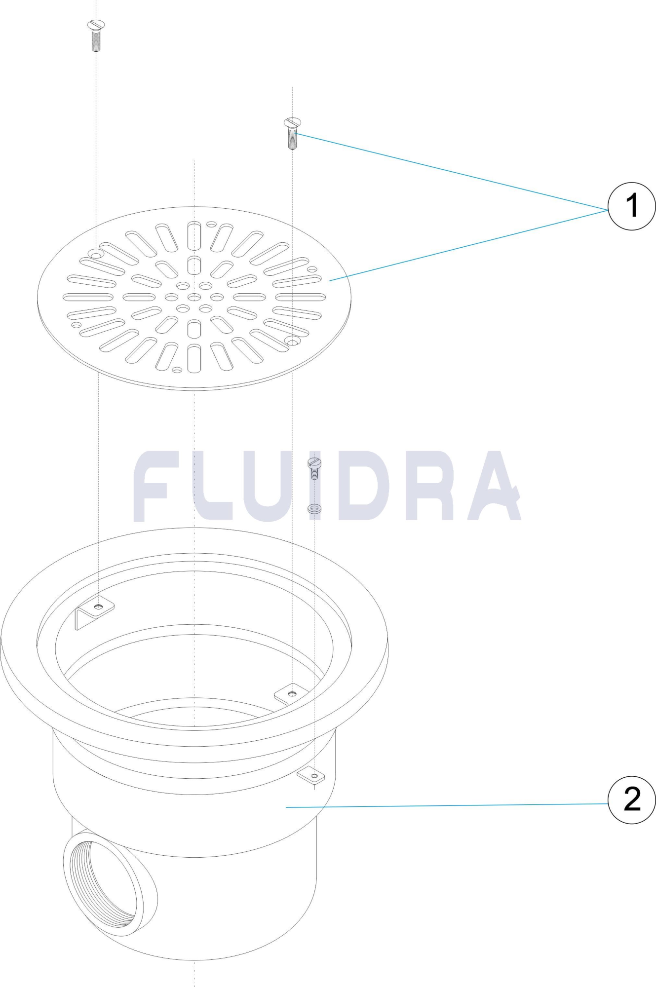 Saída lateral de 2". De aço inoxidável. AISI-316L. Grelha montada com parafusos. Caudal máximo: 13 m3/h.