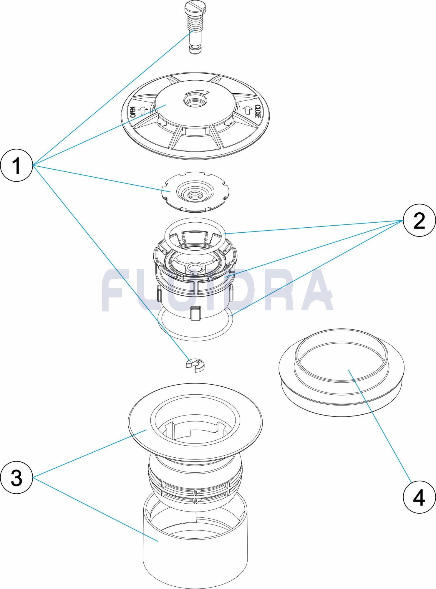 Corpo giratório de PVC. Tampa de ABS. Parafuso de ajustamento de POM. Caudal máximo de 10 m3/h. Para tubos de Ø 75 mm e a conduta de parede com código 21248.