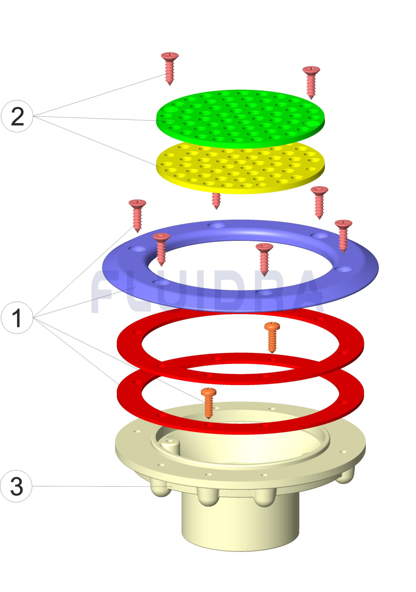 Com juntas, flange e parafusos. Três posições reguláveis: (100 %, 65 %, 35 %). Caudal: 13,5 m3/h. Ligação exterior de Ø 63 mm.