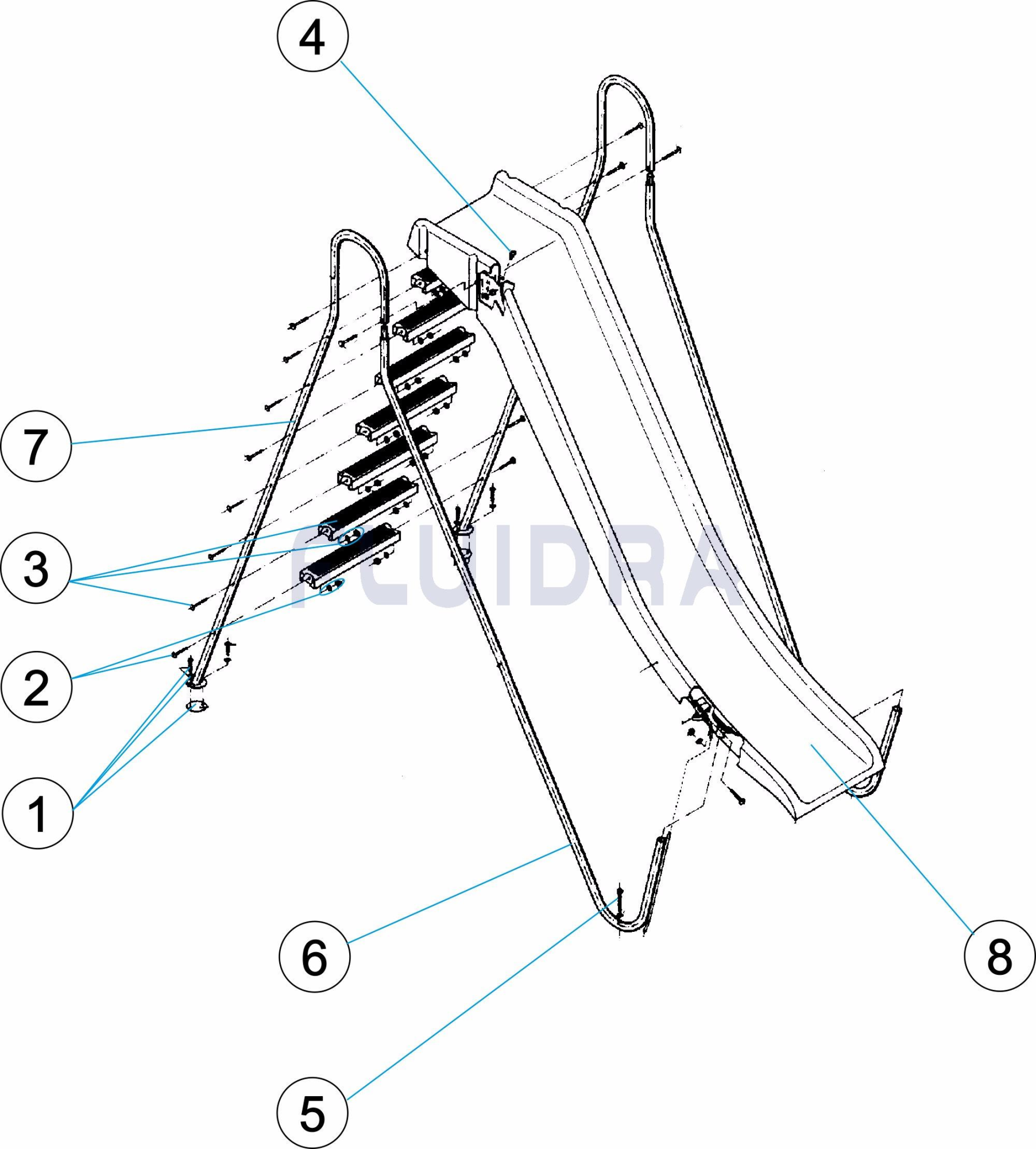 Pista em poliéster e fibra de vidro cor azul clara. Degraus em material plástico. Corrimões em aço inoxidável polido AISI-304. Equipamento com tomada de água para facilitar o deslizamento. Fornece-se com ancoragens.
