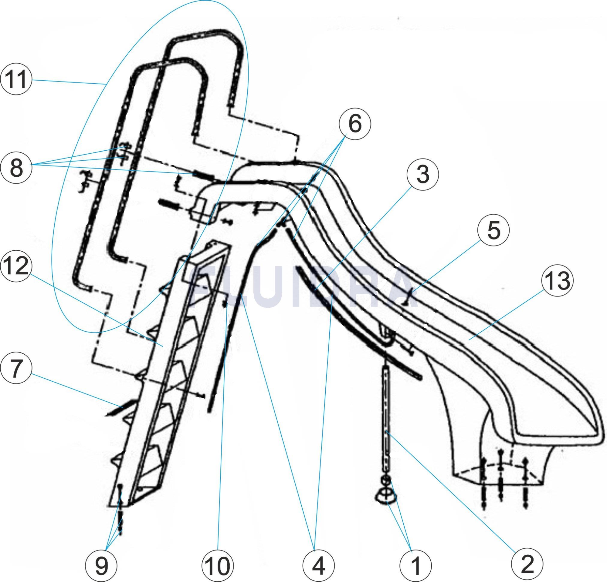 Pista e escada em poliéster e fibra de vidro de cor azul clara. Corrimões em alumínio pintado de branco.