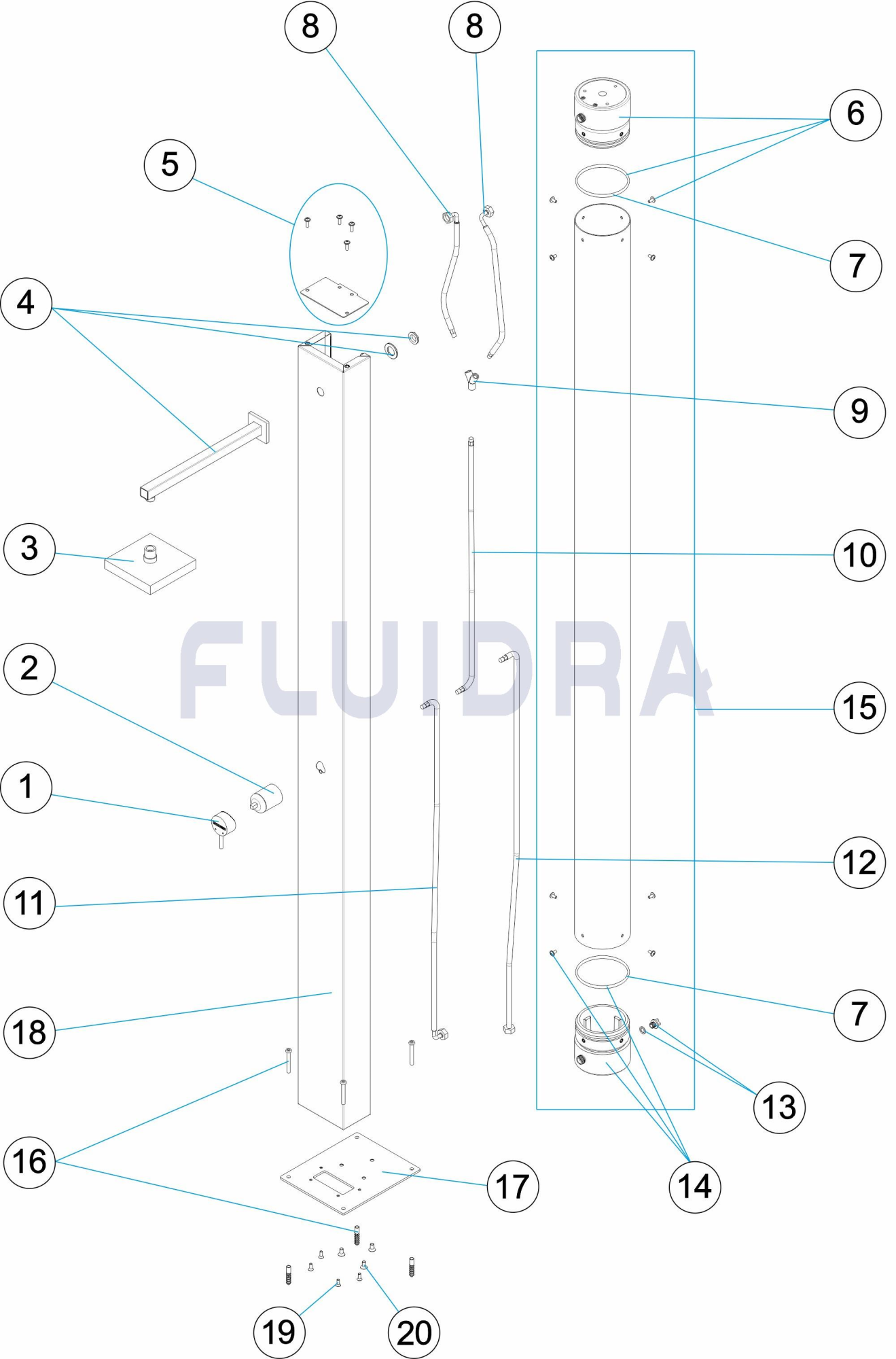 Chuveiro de aço inoxidável polido AISI-304 que incorpora um spray de topo quadrado cromado (150mm x 150mm), uma válvula misturadora (quente e fria) e um tanque de alumínio de 30 litros de capacidade.