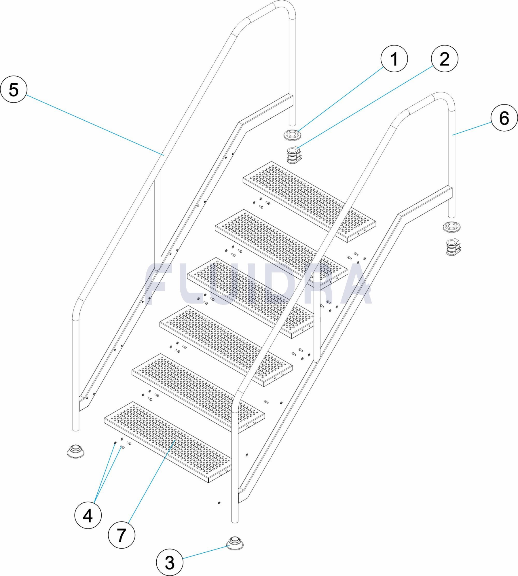 Escada pública de aço inoxidável polido AISI-316. Passe com perfuraçào antiderrapante. Feito de acordo com a norma EN 13451-2.