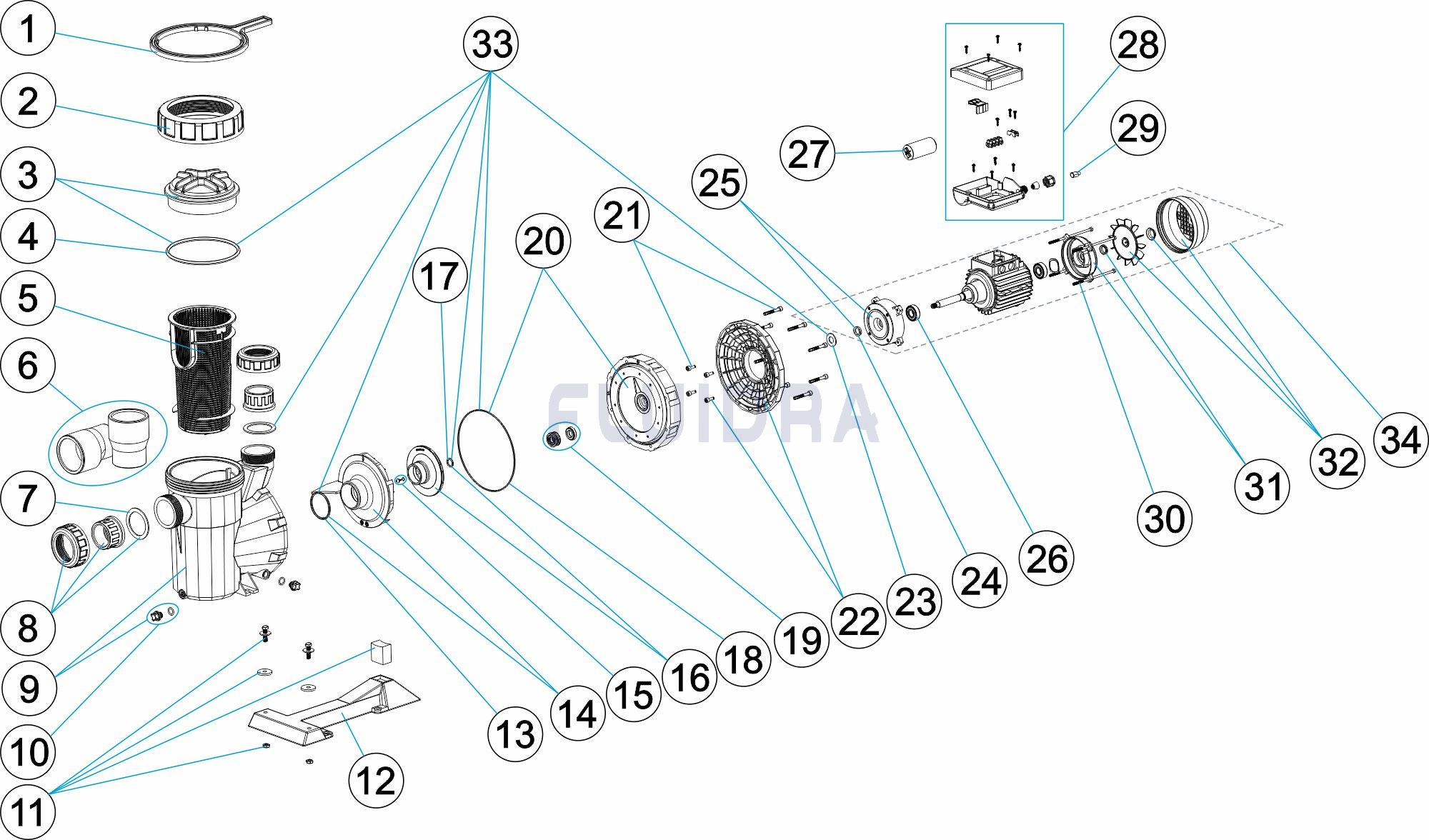 Design suave e robusto, porca da tampa do pré-filtro da nova geraçào, fácil de manusear. Operaçào de baixo ruído devido aos suportes de borracha em que se apoia. Protecçào do motor IP-55. Cesta pré-filtro de grande capacidade. Caudal em l / h a 8 m.c.a. para 1/2 CV e 10 m.c.a. de 3/4 CV. 3.000 rpm. A bomba Astral Victoria Plus emergiu da fusào das bombas Astral Victoria e Sprint. Todos os componentes foram combinados entre os componentes das bombas Victoria e Sprint. Nova tampa de pré-filtro: Victoria Plus terá uma nova tampa de pré-filtro de tipo cruzado totalmente compatível com as bombas Astral Sprint e Victoria. Este novo design de tampa unificará a imagem das bombas Columbia, Sena e Victoria Plus. Pé bomba: o pé da bomba foi combinado entre os pés da gama Victoria e Sprint. O pé da bomba para os tamanhos C.63 e C.71, relacionados ao tipo de energia até 1CV, vem da faixa Sprint. O pé da bomba para o tamanho C.80 e C.90, relacionada ao tipo de energia 3CV, vem da gama Victoria. Esta combinaçào foi introduzida com o objetivo de melhorar o suporte da bomba e do motor quando seja necessário, um pequeno pé é introduzido quando o tipo de motor é pequeno e um pé longo para os tipos de motores maiores. De acordo com a classe de eficiência energética IE2.
