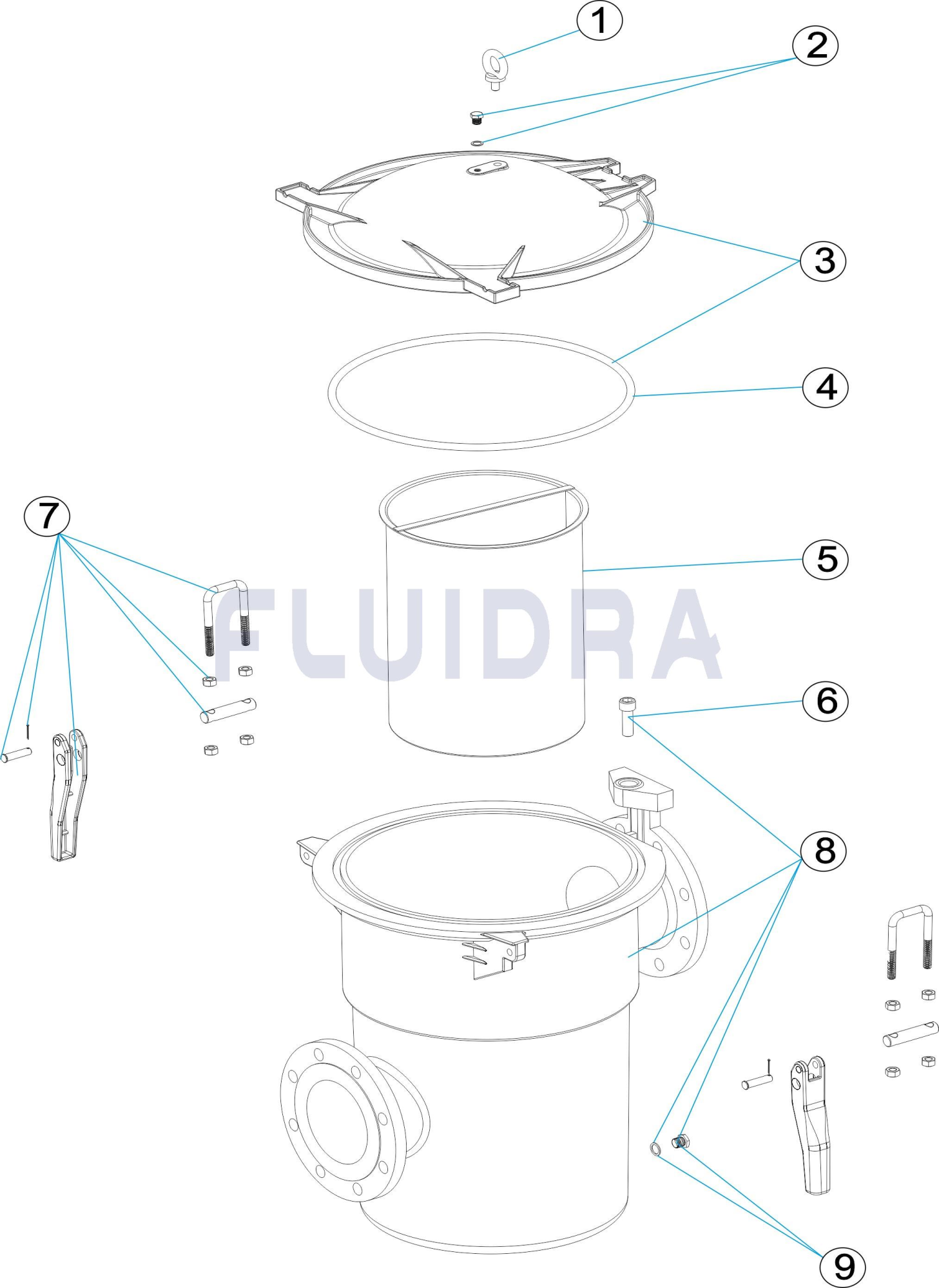Flanges perfuradas de acordo com a norma DIN-2501. Cesta em aço inoxidável AISI-316. Pressào de operaçào máxima de 2,5 bar. Sistema de bloqueio rápido. Diâmetro da malha de furo: Ø 5 mm
