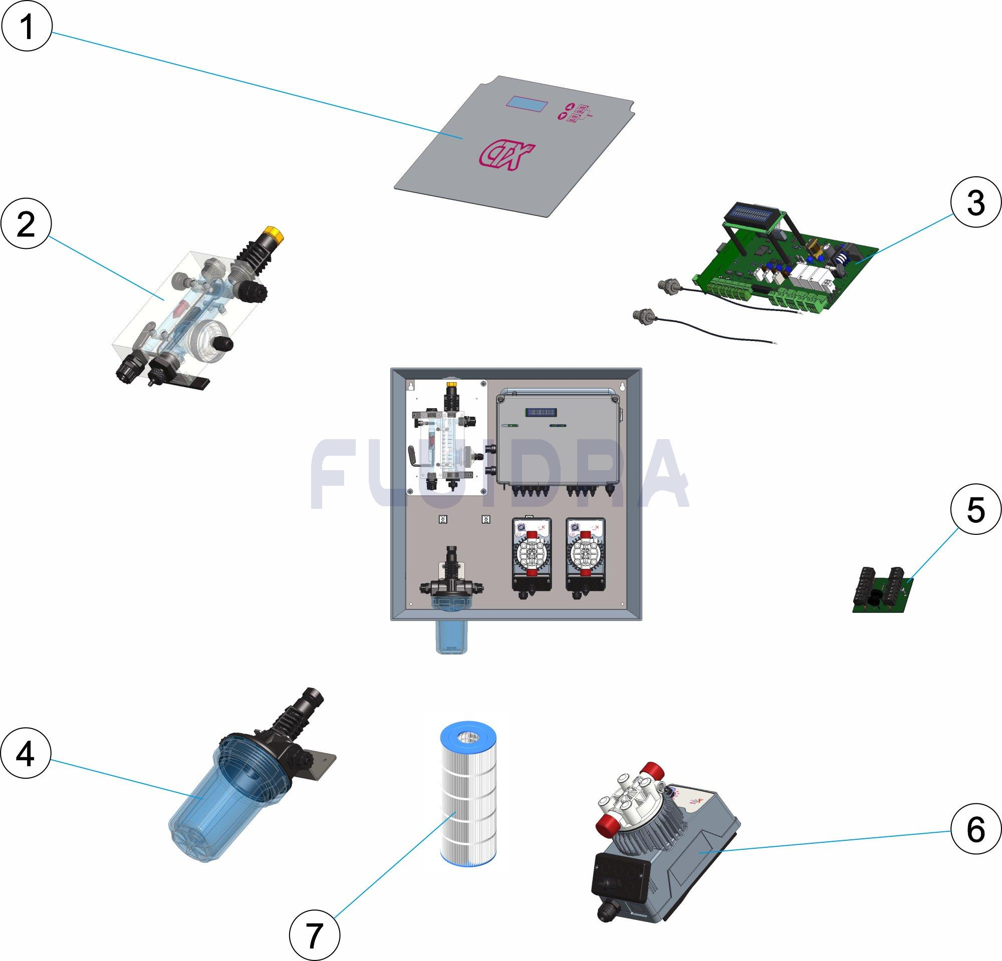 Painel de doseamento e controlo pH/ppm e pH/Rx com bombas doseadoras com controlo único. Caudal de 5 l/h